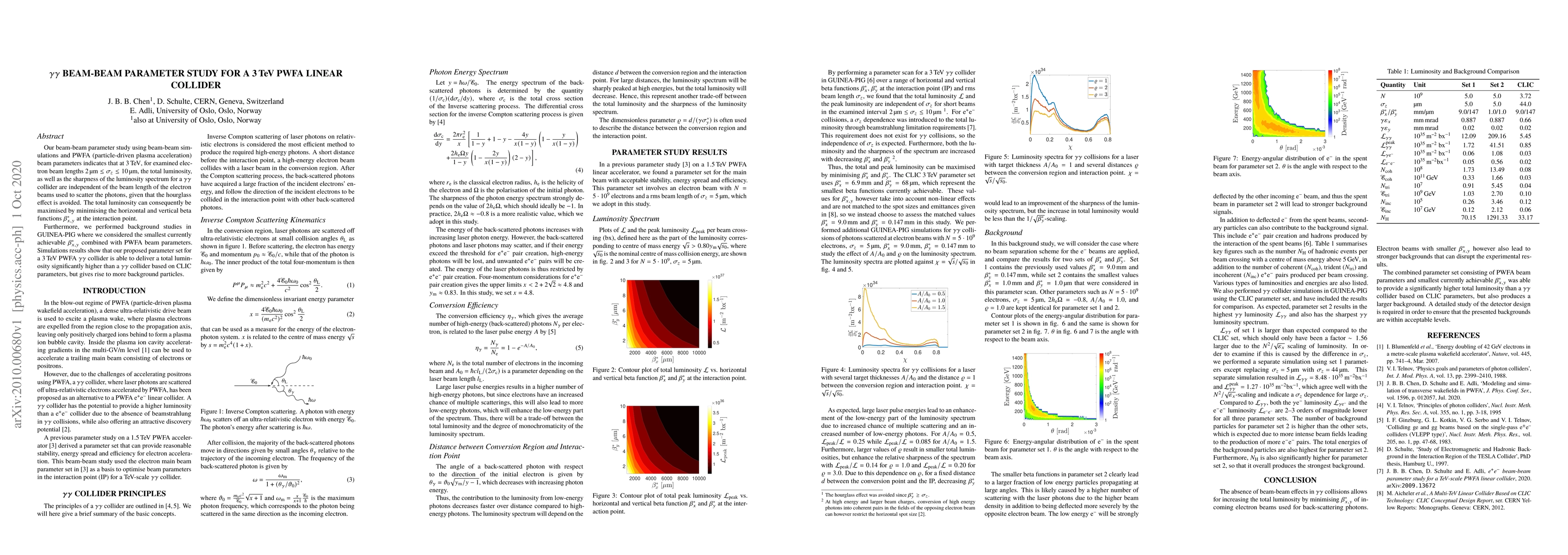 Our beam-beam parameter study using beam-beam simulations and PWFA (particle-driven plasma acceleration) beam parameters indicates that at 3 TeV, for examined electron beam lengths ${2~\mu\mathrm{m}\leq\sigma_z\leq 10~\mu\mathrm{m}}$, the total luminosity, as well as the sharpness of the luminosity spectrum for a $\gamma\gamma$ collider are independent of the beam length of the electron beams used to scatter the photons, given that the hourglass effect is avoided. The total luminosity can consequently be maximised by minimising the horizontal and vertical beta functions $\beta_{x,y}^*$ at the interaction point. Furthermore, we performed background studies in GUINEA-PIG where we considered the smallest currently achievable $\beta_{x,y}^*$ combined with PWFA beam parameters. Simulations results show that our proposed parameter set for a 3 TeV PWFA $\gamma\gamma$ collider is able to deliver a total luminosity significantly higher than a $\gamma\gamma$ collider based on CLIC parameters, but gives rise to more background particles.