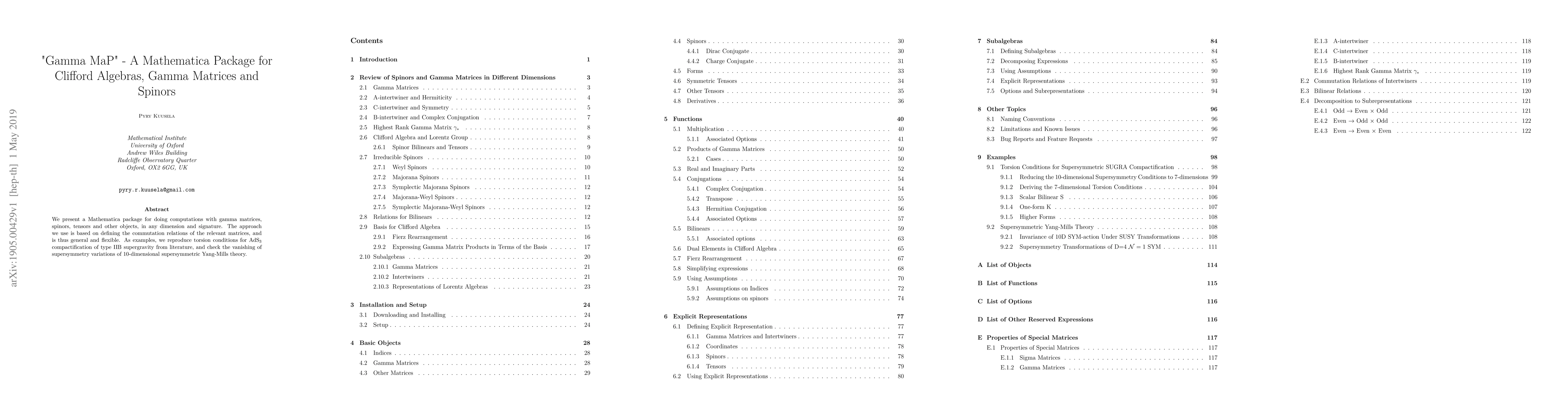 This Mathematica package, GammaMaP, facilitates computations involving gamma matrices, spinors, and tensors across any dimension and signature by defining their commutation relations. It exemplifies its utility by verifying torsion conditions for $AdS_3$ compactification and checking the vanishing of supersymmetry variations in 10-dimensional supersymmetric Yang-Mills theory.