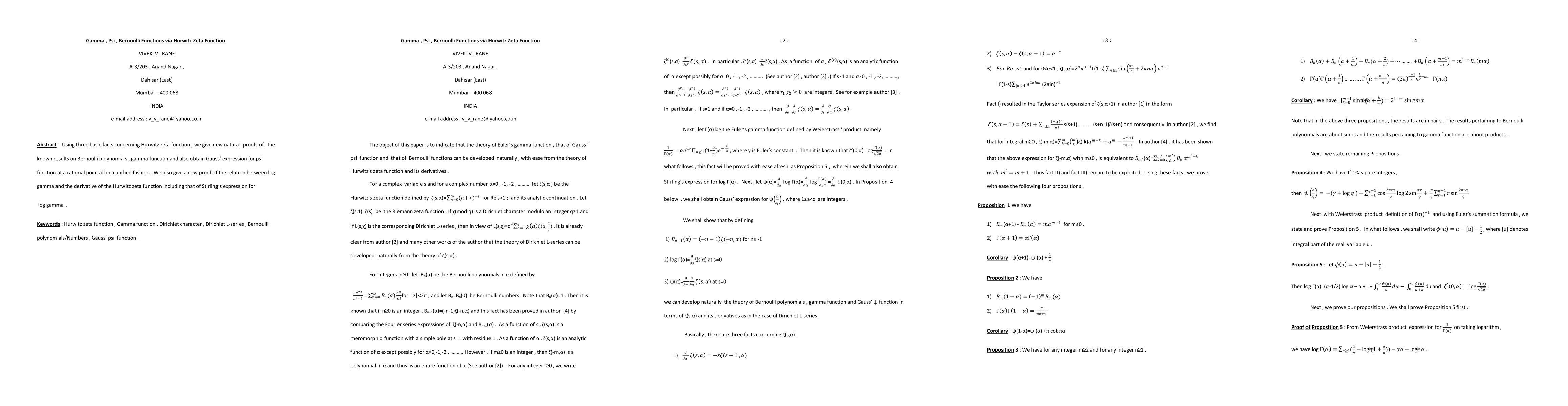 Using three basic facts concerning Hurwitz zeta function,we give new natural proofs of the known results on Bernoulli polynomials,gamma function and also obtain Gauss' expression for Psi function at a rational point,all in a unified fashion.We also give a new proof of the relation between log gamma and derivative of the Hurwitz zeta function,including that of Stirling's expression for log gamma.