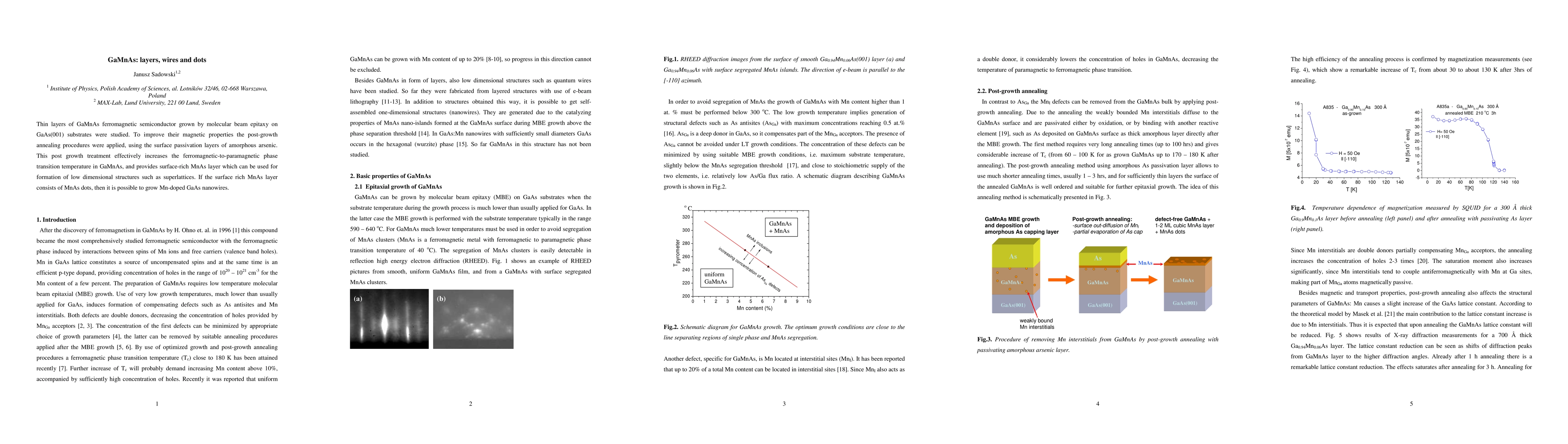 This study investigates thin GaMnAs ferromagnetic semiconductor layers grown on GaAs substrates, enhancing their magnetic properties through post-growth annealing with amorphous arsenic. This treatment raises the transition temperature and enables the formation of low-dimensional structures like superlattices and Mn-doped GaAs nanowires.