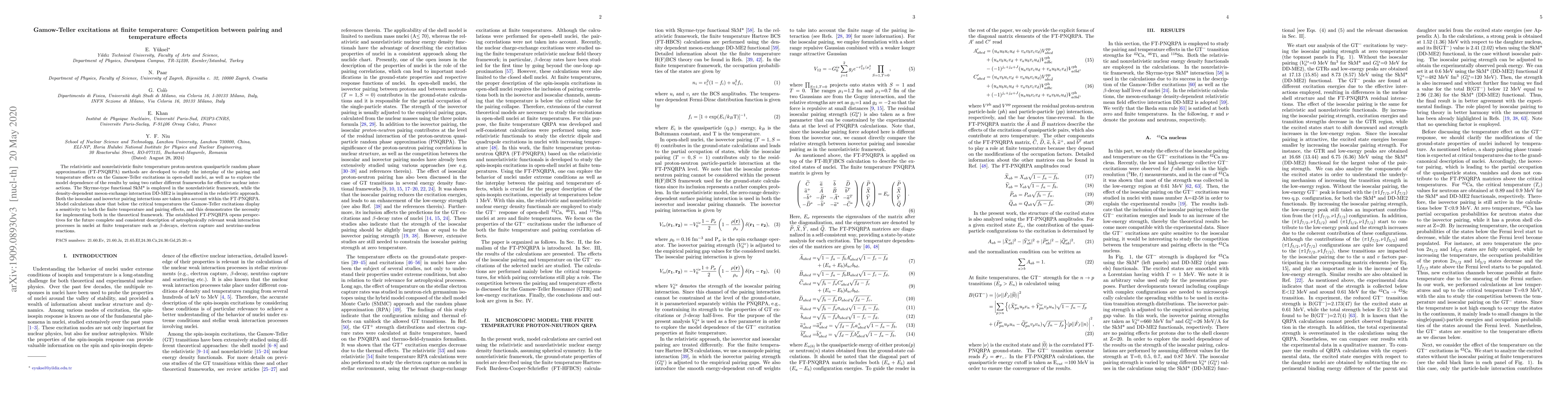 This paper develops relativistic and nonrelativistic finite temperature proton-neutron quasiparticle random phase approximation methods to study the interplay of pairing and temperature effects on Gamow-Teller excitations in open-shell nuclei. The results highlight the necessity of incorporating both effects in theoretical frameworks for accurate descriptions of astrophysical weak interaction processes.