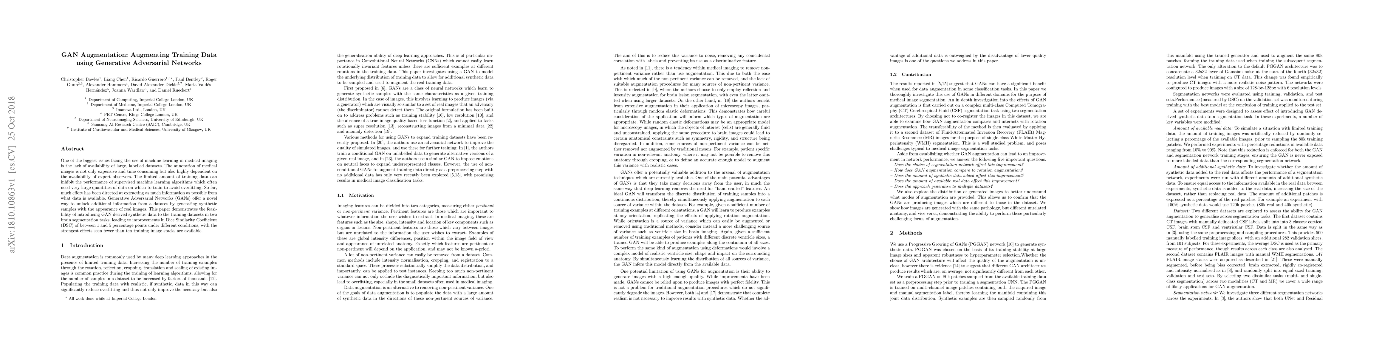 This paper demonstrates the effectiveness of using Generative Adversarial Networks (GANs) to augment medical imaging datasets, improving brain segmentation performance by 1-5 percentage points with limited training data.