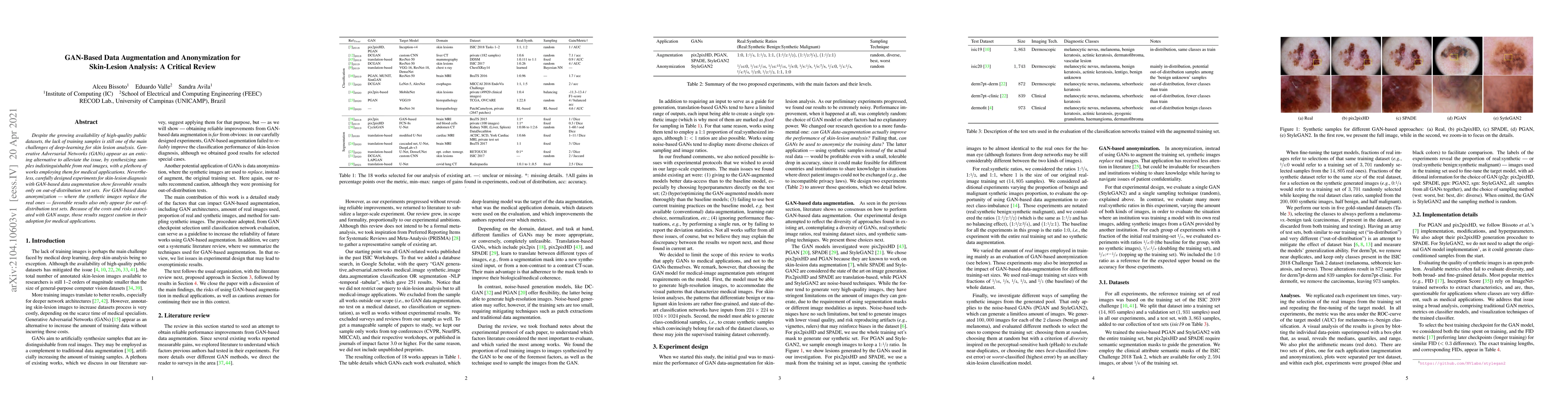 The paper critically reviews the application of Generative Adversarial Networks (GANs) for data augmentation and anonymization in skin-lesion analysis, evaluating various GAN architectures (pix2pixHD, SPADE, PGAN, StyleGAN2) across multiple datasets (ISIC19, ISIC20, derm7pt-derm, derm7pt-clinic, dermofit).