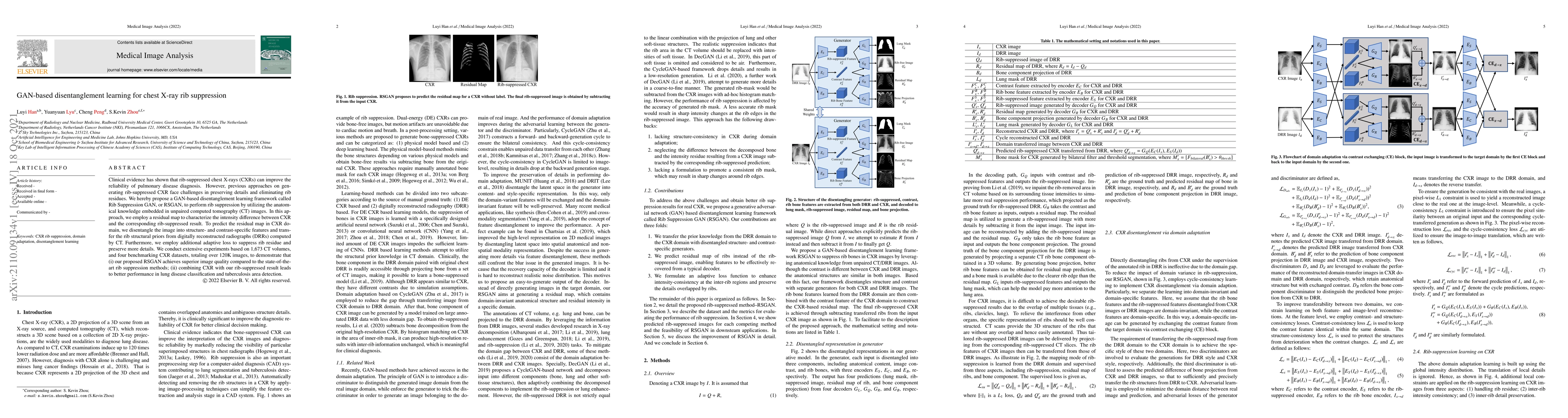 The paper proposes a GAN-based disentanglement learning framework called RSGAN for rib suppression in chest X-rays, leveraging unpaired CT images to improve diagnostic reliability. The method achieves superior image quality and enhances lung disease classification and tuberculosis detection compared to existing methods.