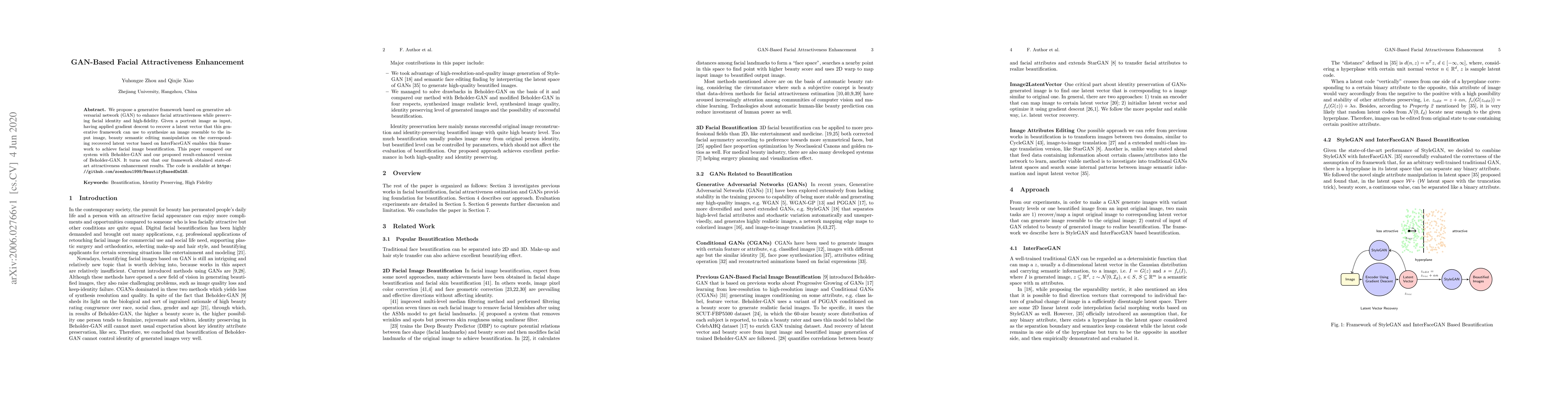 This paper presents a GAN-based framework for enhancing facial attractiveness while maintaining identity and high-fidelity. The proposed method uses gradient descent to recover latent vectors and applies beauty semantic editing to achieve beautification, outperforming existing models like Beholder-GAN.