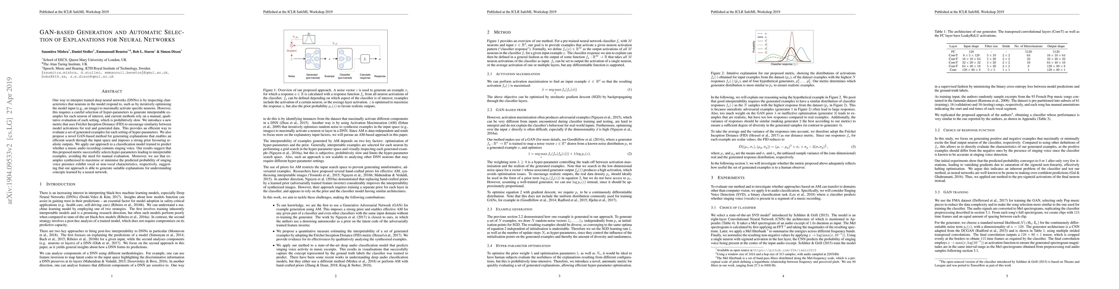 One way to interpret trained deep neural networks (DNNs) is by inspecting characteristics that neurons in the model respond to, such as by iteratively optimising the model input (e.g., an image) to maximally activate specific neurons. However, this requires a careful selection of hyper-parameters to generate interpretable examples for each neuron of interest, and current methods rely on a manual, qualitative evaluation of each setting, which is prohibitively slow. We introduce a new metric that uses Fr\'echet Inception Distance (FID) to encourage similarity between model activations for real and generated data. This provides an efficient way to evaluate a set of generated examples for each setting of hyper-parameters. We also propose a novel GAN-based method for generating explanations that enables an efficient search through the input space and imposes a strong prior favouring realistic outputs. We apply our approach to a classification model trained to predict whether a music audio recording contains singing voice. Our results suggest that this proposed metric successfully selects hyper-parameters leading to interpretable examples, avoiding the need for manual evaluation. Moreover, we see that examples synthesised to maximise or minimise the predicted probability of singing voice presence exhibit vocal or non-vocal characteristics, respectively, suggesting that our approach is able to generate suitable explanations for understanding concepts learned by a neural network.