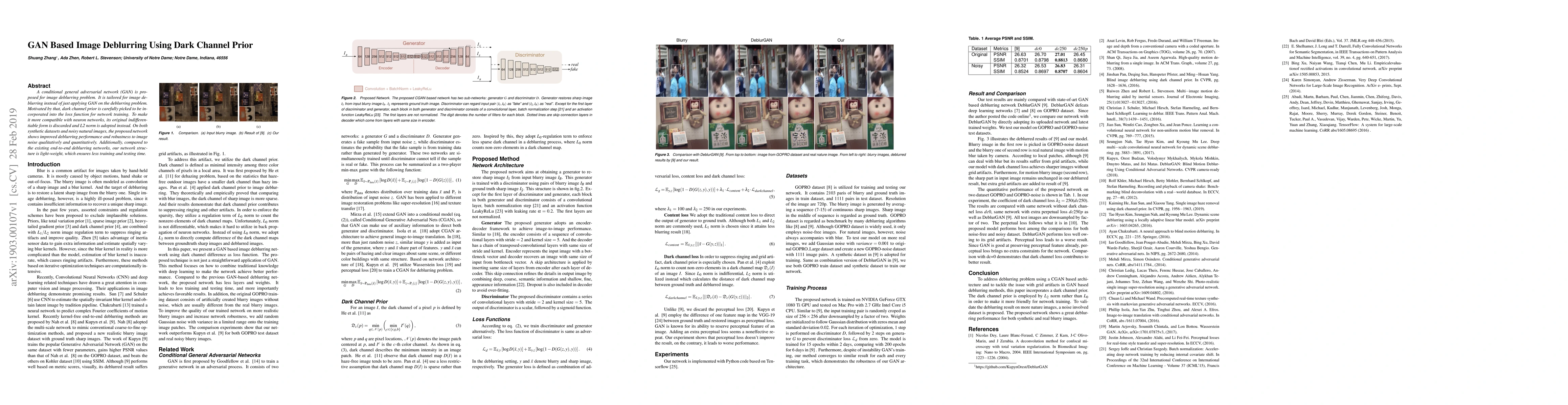 This paper proposes a conditional GAN for image deblurring that incorporates a dark channel prior into the loss function, improving deblurring performance and robustness. The network is lightweight, ensuring faster training and testing times compared to existing methods.