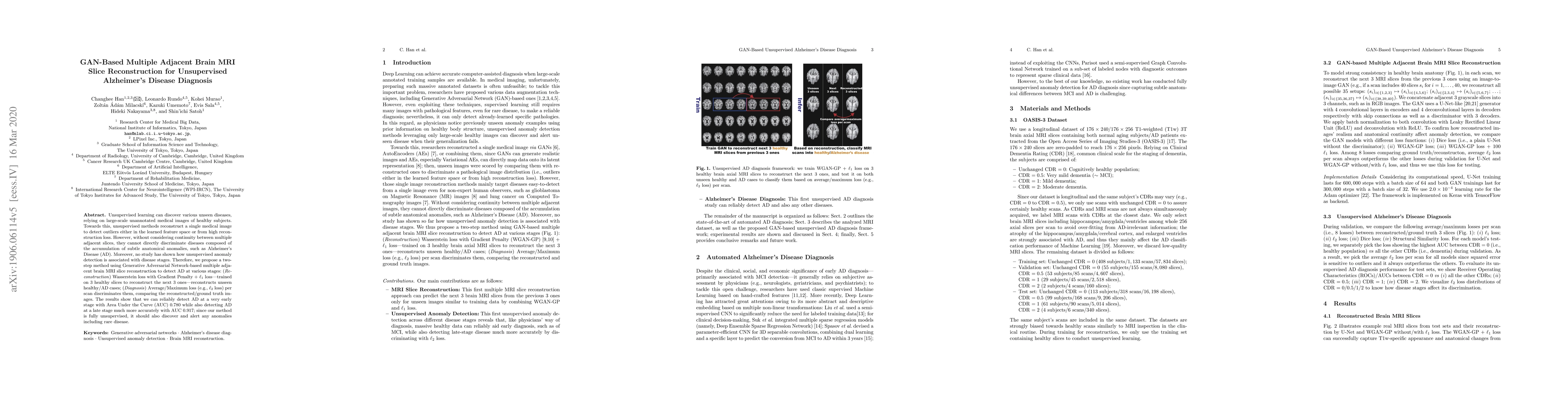 This paper proposes a GAN-based method for reconstructing multiple adjacent brain MRI slices to detect Alzheimer's Disease (AD) at various stages in an unsupervised manner. The method uses a combination of Wasserstein and L1 losses for reconstruction and average/maximum losses for diagnosis, achieving early AD detection with an AUC of 0.780 and late-stage detection with an AUC of 0.917.