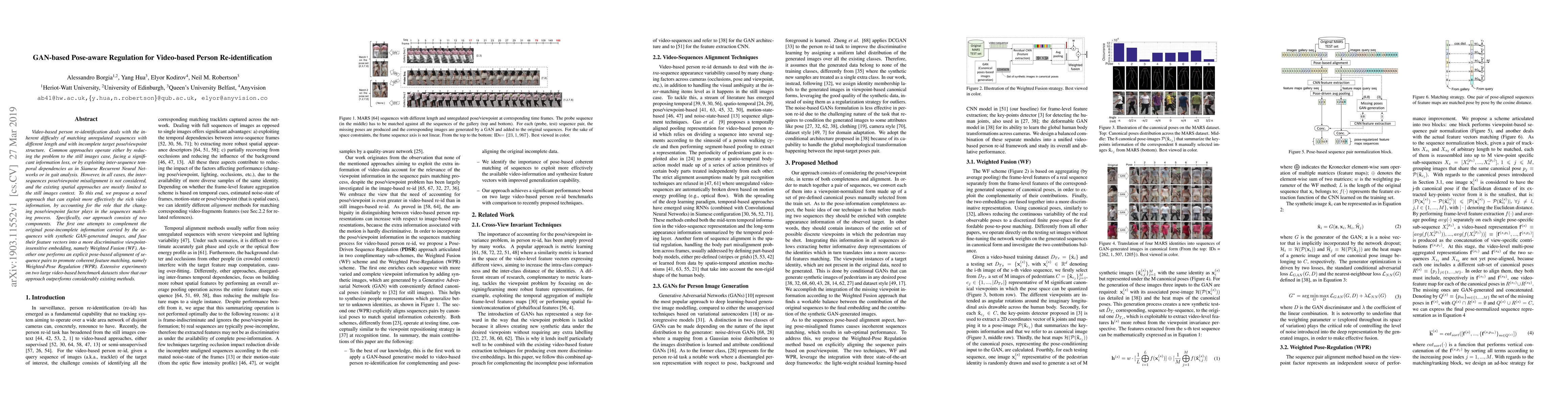 Video-based person re-identification deals with the inherent difficulty of matching unregulated sequences with different length and with incomplete target pose/viewpoint structure. Common approaches operate either by reducing the problem to the still images case, facing a significant information loss, or by exploiting inter-sequence temporal dependencies as in Siamese Recurrent Neural Networks or in gait analysis. However, in all cases, the inter-sequences pose/viewpoint misalignment is not considered, and the existing spatial approaches are mostly limited to the still images context. To this end, we propose a novel approach that can exploit more effectively the rich video information, by accounting for the role that the changing pose/viewpoint factor plays in the sequences matching process. Specifically, our approach consists of two components. The first one attempts to complement the original pose-incomplete information carried by the sequences with synthetic GAN-generated images, and fuse their feature vectors into a more discriminative viewpoint-insensitive embedding, namely Weighted Fusion (WF). Another one performs an explicit pose-based alignment of sequence pairs to promote coherent feature matching, namely Weighted-Pose Regulation (WPR). Extensive experiments on two large video-based benchmark datasets show that our approach outperforms considerably existing methods.