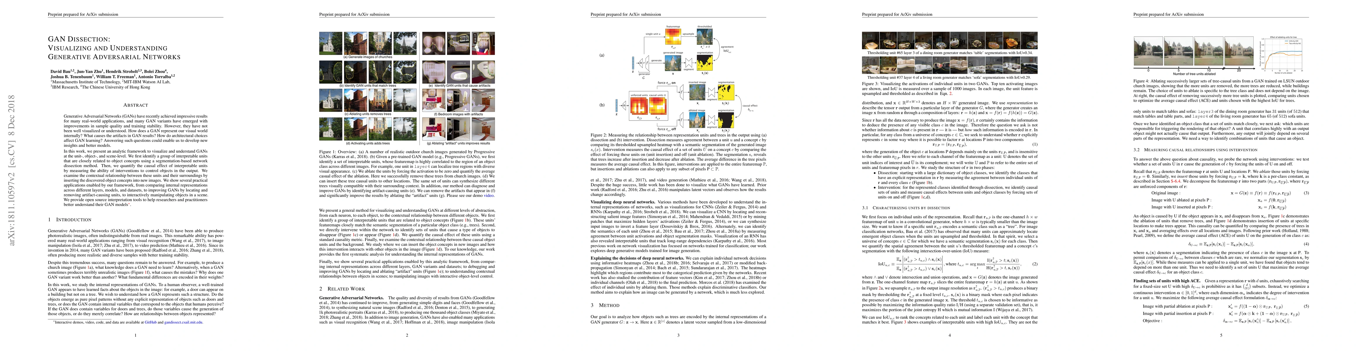This paper introduces an analytic framework to visualize and understand Generative Adversarial Networks (GANs) at various levels, identifying interpretable units related to object concepts and quantifying their causal effects. The framework enables practical applications like comparing internal representations and improving GANs by removing artifact-causing units.