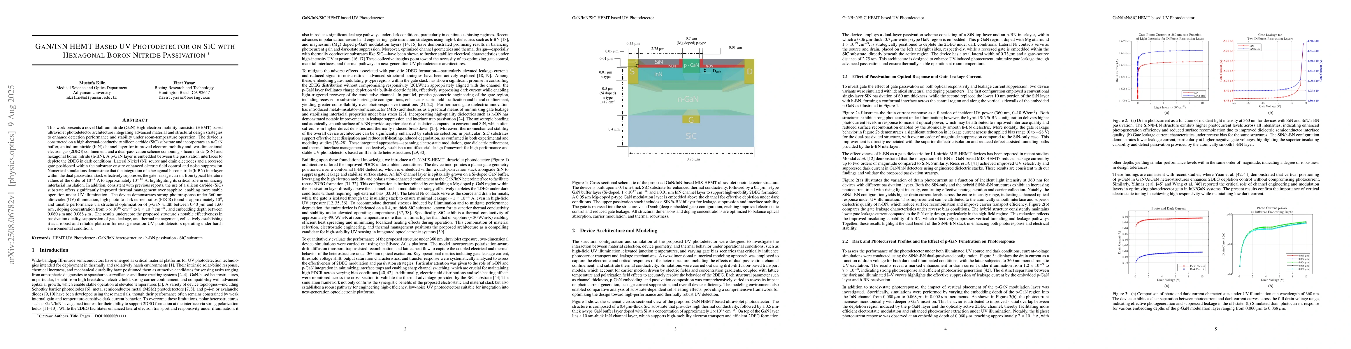 This work presents a novel Gallium nitride (GaN) high-electron-mobility transistor (HEMT) based ultraviolet photodetector architecture integrating advanced material and structural design strategies to enhance detection performance and stability under room-temperature operation. The device is constructed on a high-thermal-conductivity silicon carbide (SiC) substrate and incorporates an n-GaN buffer, an indium nitride (InN) channel layer for improved electron mobility and two-dimensional electron gas (2DEG) confinement, and a dual-passivation scheme combining silicon nitride (SiN) and hexagonal boron nitride (h-BN). A p-GaN layer is embedded between the passivation interfaces to deplete the 2DEG in dark conditions. Lateral nickel (Ni) source and drain electrodes and a recessed gate positioned within the substrate ensure enhanced electric field control and noise suppression. Numerical simulations demonstrate that the integration of a hexagonal boron nitride (h-BN) interlayer within the dual passivation stack effectively suppresses the gate leakage current from typical literature values of the order of $10^{-7}$~A to approximately $10^{-10}$~A, highlighting its critical role in enhancing interfacial insulation. In addition, consistent with previous reports, the use of a silicon carbide (SiC) substrate offers significantly improved thermal management over sapphire, enabling more stable operation under UV illumination. The device demonstrates strong photoresponse under 360~nm ultraviolet (UV) illumination, high photo-to-dark current ratios (PDCR) of approximately $10^{6}$, and tunable performance via structural optimization of p-GaN width between 0.40~$\mu$m and 1.60~$\mu$m, doping concentration from $5 \times 10^{16}$~cm$^{-3}$ to $5 \times 10^{18}$~cm$^{-3}$, and embedding depth between 0.060~$\mu$m and 0.068~$\mu$m.