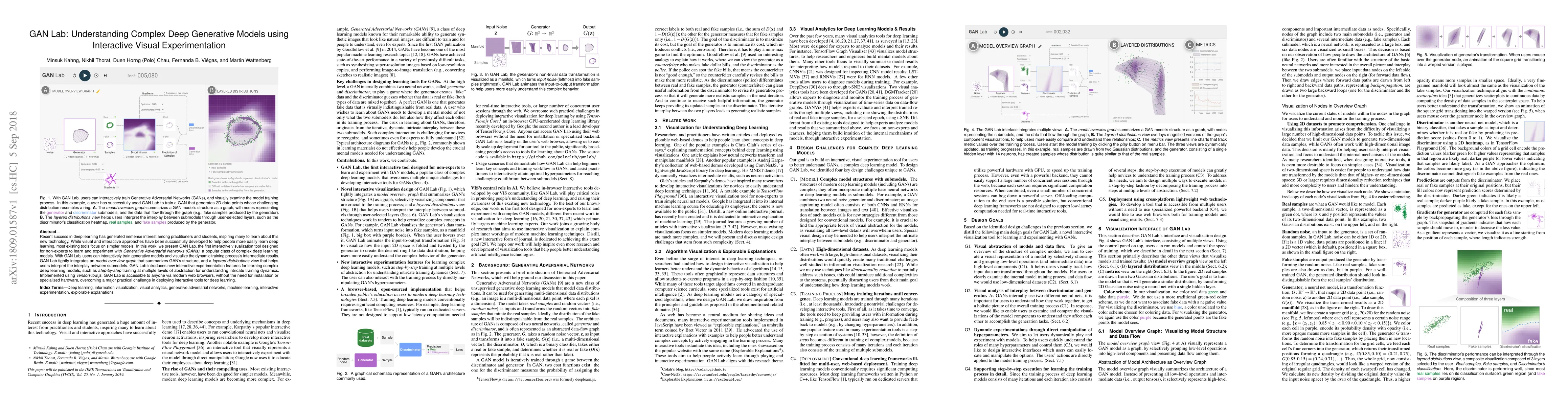 GAN Lab is an interactive visualization tool for Generative Adversarial Networks (GANs), built using TensorFlow.js, allowing users to experiment with GANs through direct manipulation of hyperparameters and step-by-step training at multiple levels of abstraction.