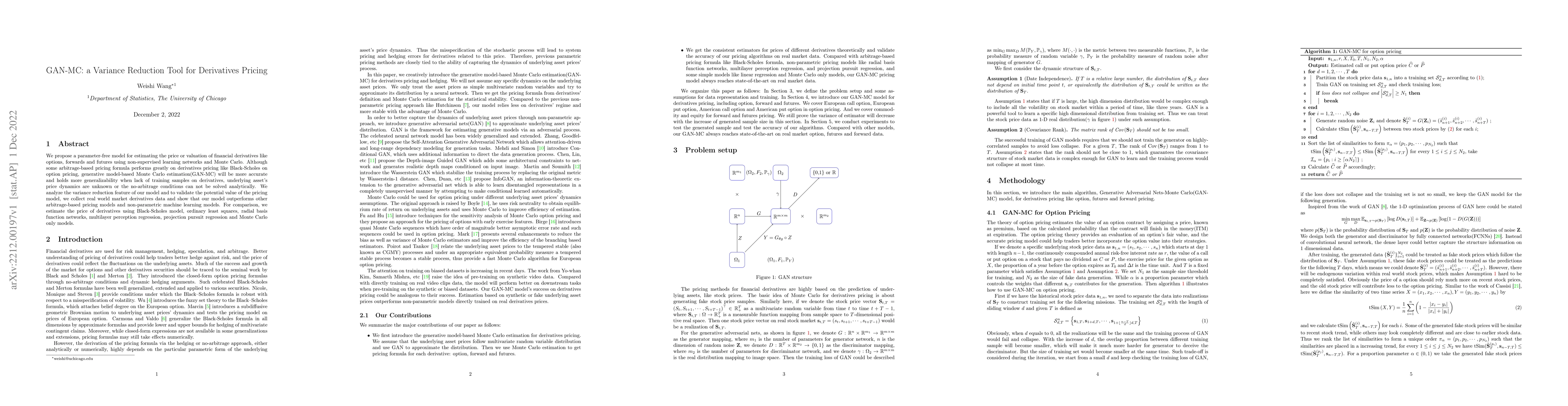 We propose a parameter-free model for estimating the price or valuation of financial derivatives like options, forwards and futures using non-supervised learning networks and Monte Carlo. Although some arbitrage-based pricing formula performs greatly on derivatives pricing like Black-Scholes on option pricing, generative model-based Monte Carlo estimation(GAN-MC) will be more accurate and holds more generalizability when lack of training samples on derivatives, underlying asset's price dynamics are unknown or the no-arbitrage conditions can not be solved analytically. We analyze the variance reduction feature of our model and to validate the potential value of the pricing model, we collect real world market derivatives data and show that our model outperforms other arbitrage-based pricing models and non-parametric machine learning models. For comparison, we estimate the price of derivatives using Black-Scholes model, ordinary least squares, radial basis function networks, multilayer perception regression, projection pursuit regression and Monte Carlo only models.