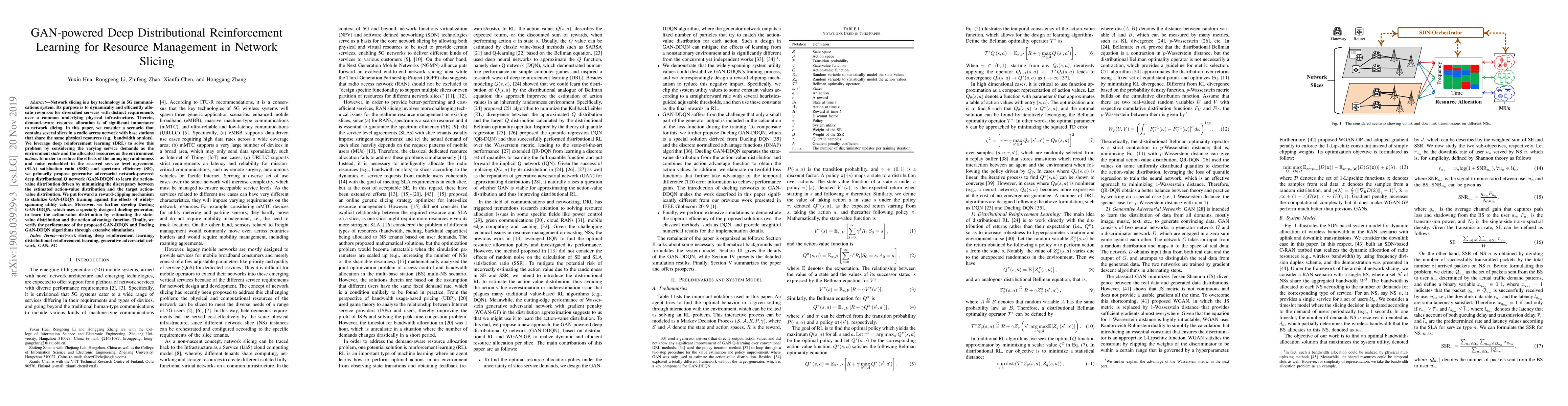 Network slicing is a key technology in 5G communications system. Its purpose is to dynamically and efficiently allocate resources for diversified services with distinct requirements over a common underlying physical infrastructure. Therein, demand-aware resource allocation is of significant importance to network slicing. In this paper, we consider a scenario that contains several slices in a radio access network with base stations that share the same physical resources (e.g., bandwidth or slots). We leverage deep reinforcement learning (DRL) to solve this problem by considering the varying service demands as the environment state and the allocated resources as the environment action. In order to reduce the effects of the annoying randomness and noise embedded in the received service level agreement (SLA) satisfaction ratio (SSR) and spectrum efficiency (SE), we primarily propose generative adversarial network-powered deep distributional Q network (GAN-DDQN) to learn the action-value distribution driven by minimizing the discrepancy between the estimated action-value distribution and the target action-value distribution. We put forward a reward-clipping mechanism to stabilize GAN-DDQN training against the effects of widely-spanning utility values. Moreover, we further develop Dueling GAN-DDQN, which uses a specially designed dueling generator, to learn the action-value distribution by estimating the state-value distribution and the action advantage function. Finally, we verify the performance of the proposed GAN-DDQN and Dueling GAN-DDQN algorithms through extensive simulations.