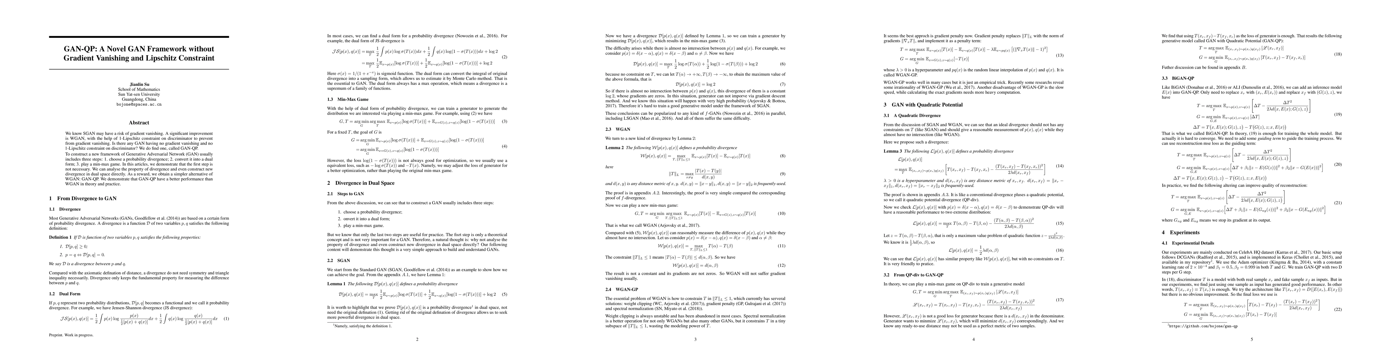 We know SGAN may have a risk of gradient vanishing. A significant improvement is WGAN, with the help of 1-Lipschitz constraint on discriminator to prevent from gradient vanishing. Is there any GAN having no gradient vanishing and no 1-Lipschitz constraint on discriminator? We do find one, called GAN-QP. To construct a new framework of Generative Adversarial Network (GAN) usually includes three steps: 1. choose a probability divergence; 2. convert it into a dual form; 3. play a min-max game. In this articles, we demonstrate that the first step is not necessary. We can analyse the property of divergence and even construct new divergence in dual space directly. As a reward, we obtain a simpler alternative of WGAN: GAN-QP. We demonstrate that GAN-QP have a better performance than WGAN in theory and practice.
