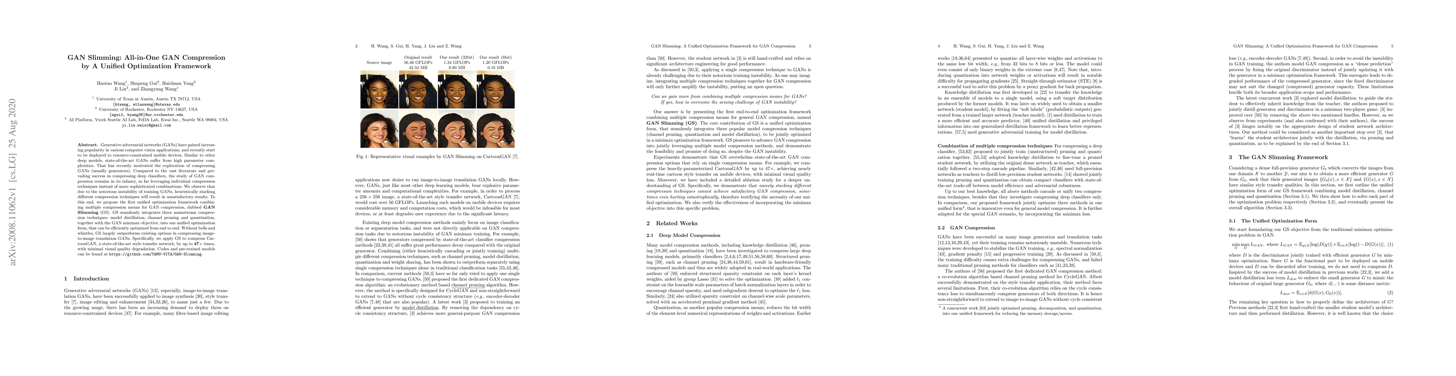 This paper proposes GAN Slimming (GS), a unified optimization framework for compressing GANs by integrating model distillation, channel pruning, and quantization within a single optimization form. GS significantly outperforms existing methods, achieving up to 47 times compression of CartoonGAN with minimal loss of visual quality.