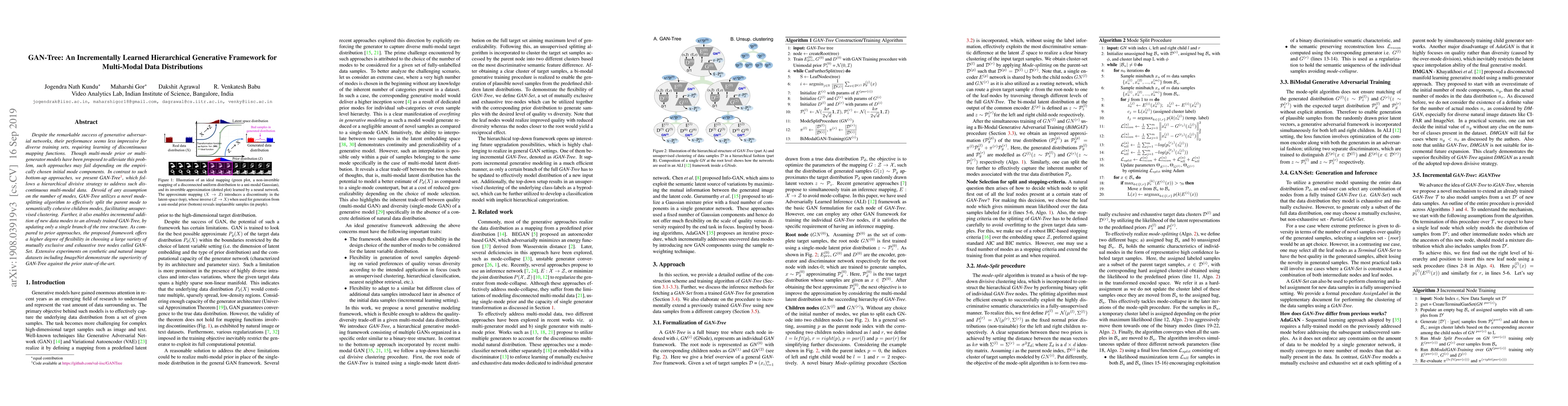 The paper introduces GAN-Tree, a hierarchical generative framework that incrementally learns multi-modal data distributions. Unlike previous methods that may struggle with empirically chosen initial components, GAN-Tree follows a divisive strategy, splitting modes into cohesive child modes, and allows for adding new data modes without retraining the entire model. It offers flexibility through GAN-Sets and outperforms prior methods in experiments on synthetic and natural image datasets, including ImageNet.