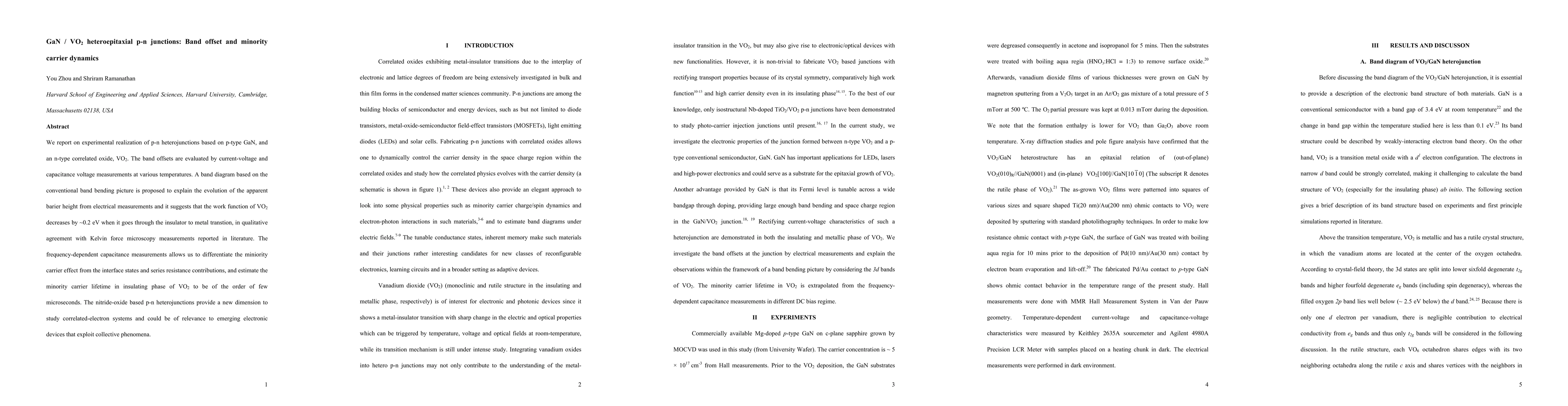 We report on experimental realization of p-n heterojunctions based on p-type GaN, and an n-type correlated oxide, VO2. The band offsets are evaluated by current-voltage and capacitance voltage measurements at various temperatures. A band diagram based on the conventional band bending picture is proposed to explain the evolution of the apparent barier height from electrical measurements and it suggests that the work function of VO2 decreases by ~0.2 eV when it goes through the insulator to metal transtion, in qualitative agreement with Kelvin force microscopy measurements reported in literature. The frequency dependent capacitance measurements allows us to differentiate the miniority carrier effect from the interface states and series resistance contributions, and estimate the minority carrier lifetime in insulating phase of VO2 to be of the order of few microseconds. The nitride-oxide based p-n heterojunctions provide a new dimension