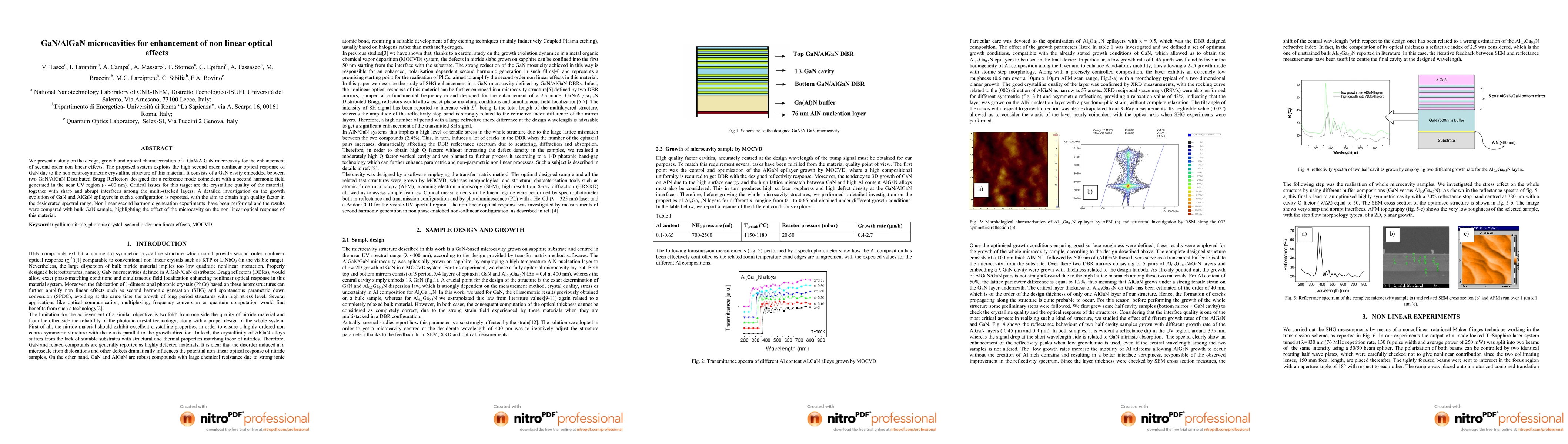 We present a study on the design, growth and optical characterization of a GaN/AlGaN microcavity for the enhancement of second order non linear effects. The proposed system exploits the high second order nonlinear optical response of GaN due to the non centrosymmetric crystalline structure of this material. It consists of a GaN cavity embedded between two GaN/AlGaN Distributed Bragg Reflectors designed for a reference mode coincident with a second harmonic field generated in the near UV region (~ 400 nm). Critical issues for this target are the crystalline quality of the material, together with sharp and abrupt interfaces among the multi-stacked layers. A detailed investigation on the growth evolution of GaN and AlGaN epilayers in such a configuration is reported, with the aim to obtain high quality factor in the desiderated spectral range. Non linear second harmonic generation experiments have been performed and the results were compared with bulk GaN sample, highlighting the effect of the microcavity on the non linear optical response of this material.