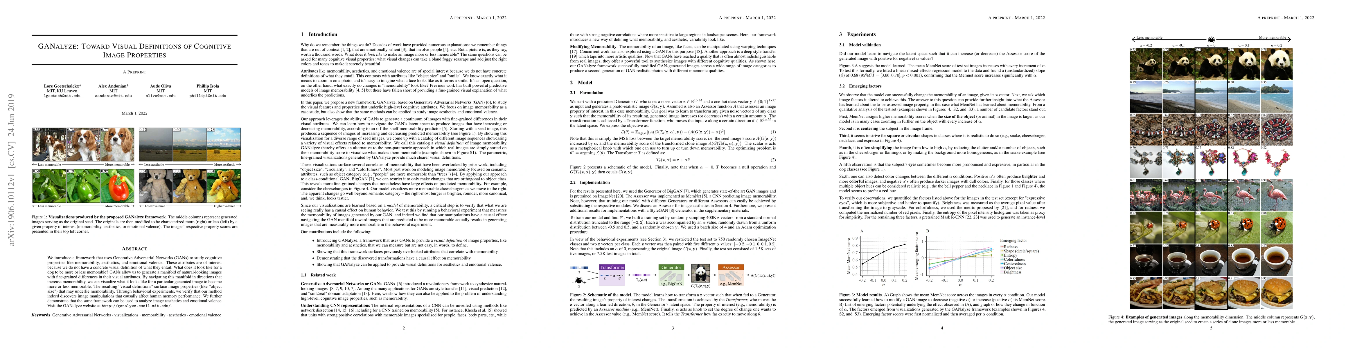 We introduce a framework that uses Generative Adversarial Networks (GANs) to study cognitive properties like memorability, aesthetics, and emotional valence. These attributes are of interest because we do not have a concrete visual definition of what they entail. What does it look like for a dog to be more or less memorable? GANs allow us to generate a manifold of natural-looking images with fine-grained differences in their visual attributes. By navigating this manifold in directions that increase memorability, we can visualize what it looks like for a particular generated image to become more or less memorable. The resulting ``visual definitions" surface image properties (like ``object size") that may underlie memorability. Through behavioral experiments, we verify that our method indeed discovers image manipulations that causally affect human memory performance. We further demonstrate that the same framework can be used to analyze image aesthetics and emotional valence. Visit the GANalyze website at http://ganalyze.csail.mit.edu/.