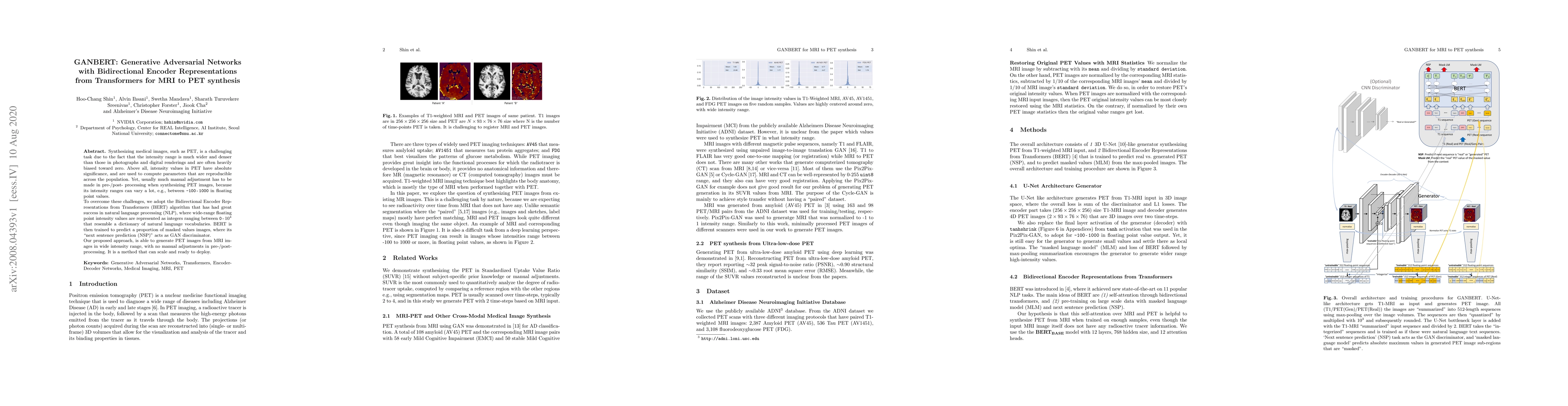 Synthesizing medical images, such as PET, is a challenging task due to the fact that the intensity range is much wider and denser than those in photographs and digital renderings and are often heavily biased toward zero. Above all, intensity values in PET have absolute significance, and are used to compute parameters that are reproducible across the population. Yet, usually much manual adjustment has to be made in pre-/post- processing when synthesizing PET images, because its intensity ranges can vary a lot, e.g., between -100 to 1000 in floating point values. To overcome these challenges, we adopt the Bidirectional Encoder Representations from Transformers (BERT) algorithm that has had great success in natural language processing (NLP), where wide-range floating point intensity values are represented as integers ranging between 0 to 10000 that resemble a dictionary of natural language vocabularies. BERT is then trained to predict a proportion of masked values images, where its "next sentence prediction (NSP)" acts as GAN discriminator. Our proposed approach, is able to generate PET images from MRI images in wide intensity range, with no manual adjustments in pre-/post- processing. It is a method that can scale and ready to deploy.