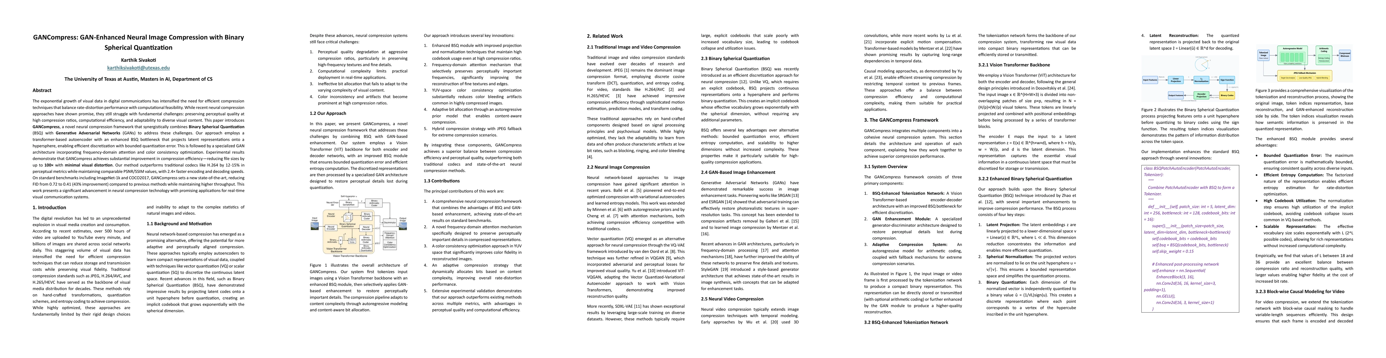 The paper introduces GANCompress, a neural compression framework that combines Binary Spherical Quantization (BSQ) with Generative Adversarial Networks (GANs). It uses a transformer-based autoencoder with an enhanced BSQ bottleneck and a specialized GAN architecture featuring frequency-domain attention and color consistency optimization.