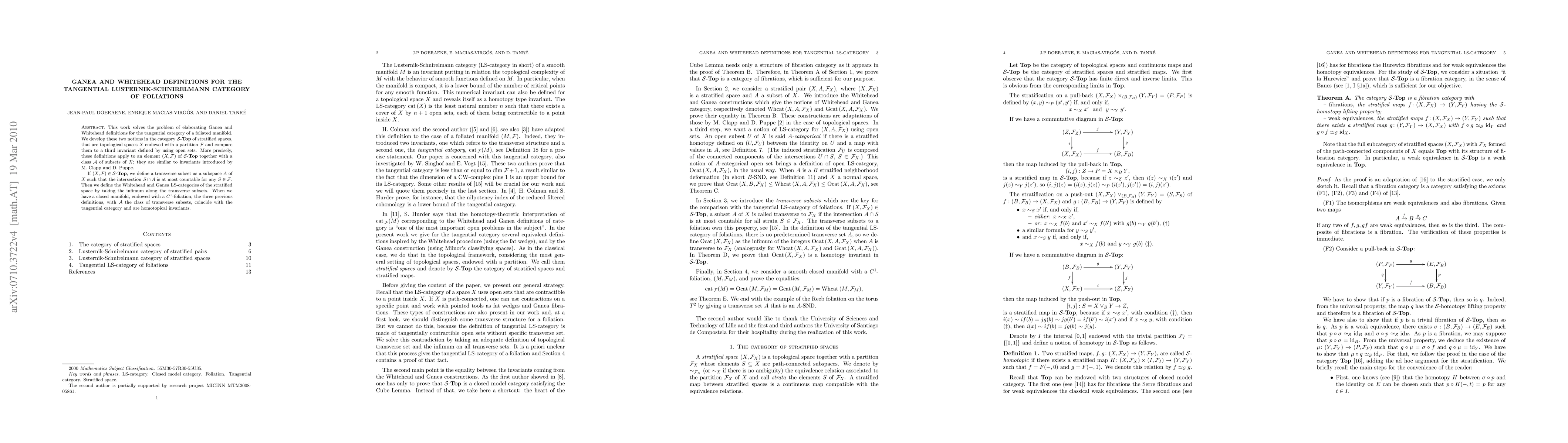 This work solves the problem of elaborating Ganea and Whitehead definitions for the tangential category of a foliated manifold. We develop these two notions in the category $\Tops$ of stratified spaces, that are topological spaces $X$ endowed with a partition $\cF$ and compare them to a third invariant defined by using open sets. More precisely, these definitions apply to an element $(X,\cF)$ of $\Tops$ together with a class $\cA$ of subsets of $X$; they are similar to invariants introduced by M. Clapp and D. Puppe. If $(X,\cF)\in\Tops$, we define a transverse subset as a subspace $A$ of $X$ such that the intersection $S\cap A$ is at most countable for any $S\in \cF$. Then we define the Whitehead and Ganea LS-categories of the stratified space by taking the infimum along the transverse subsets. When we have a closed manifold, endowed with a $C^1$-foliation, the three previous definitions, with $\cA$ the class of transverse subsets, coincide with the tangential category and are homotopical invariants.