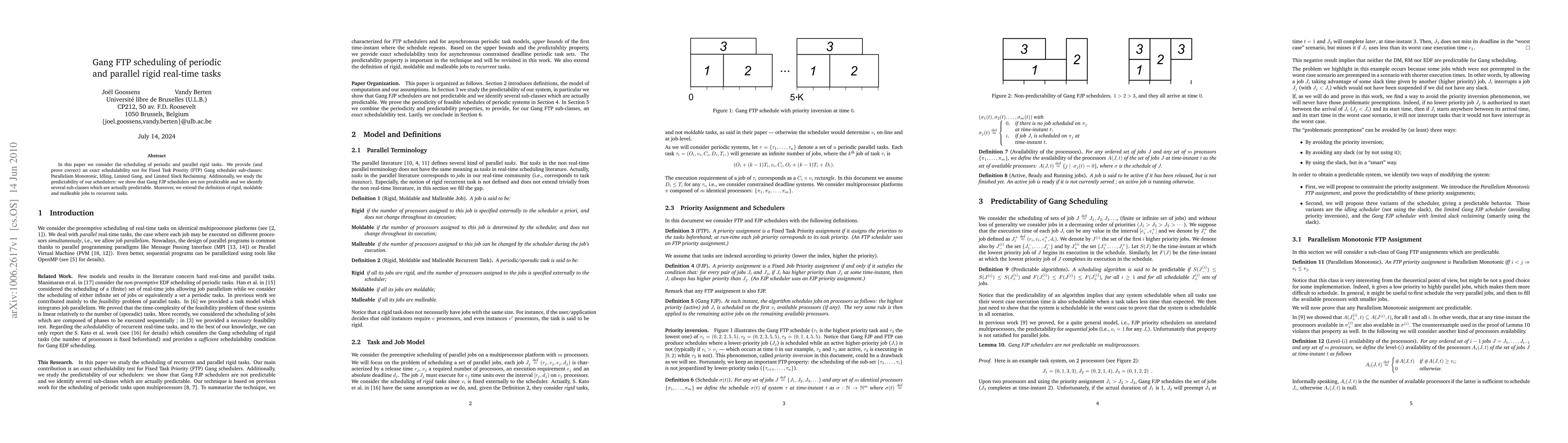 The paper presents an analysis of Fixed Task Priority (FTP) Gang schedulers for periodic and parallel rigid real-time tasks, providing an exact schedulability test for sub-classes like Parallelism Monotonic, Idling, Limited Gang, and Limited Slack Reclaiming, and proving their predictability.
