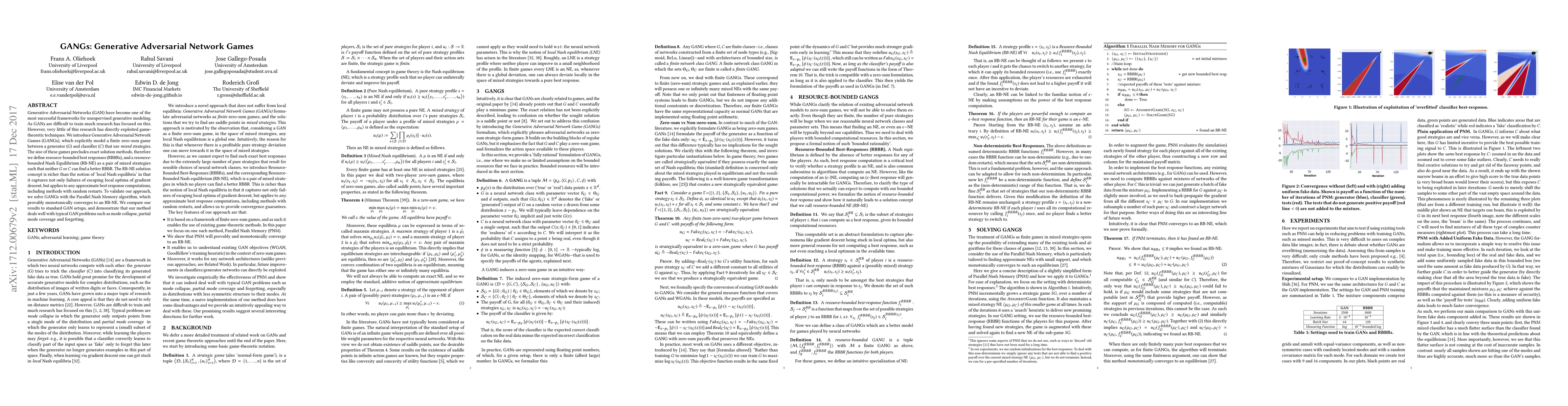 This paper introduces Generative Adversarial Network Games (GANGs), a novel framework that models the adversarial training of GANs as a finite zero-sum game using mixed strategies. The authors propose resource-bounded Nash Equilibrium (RB-NE) to address training difficulties, demonstrating improved handling of GAN issues like mode collapse through the Parallel Nash Memory algorithm.