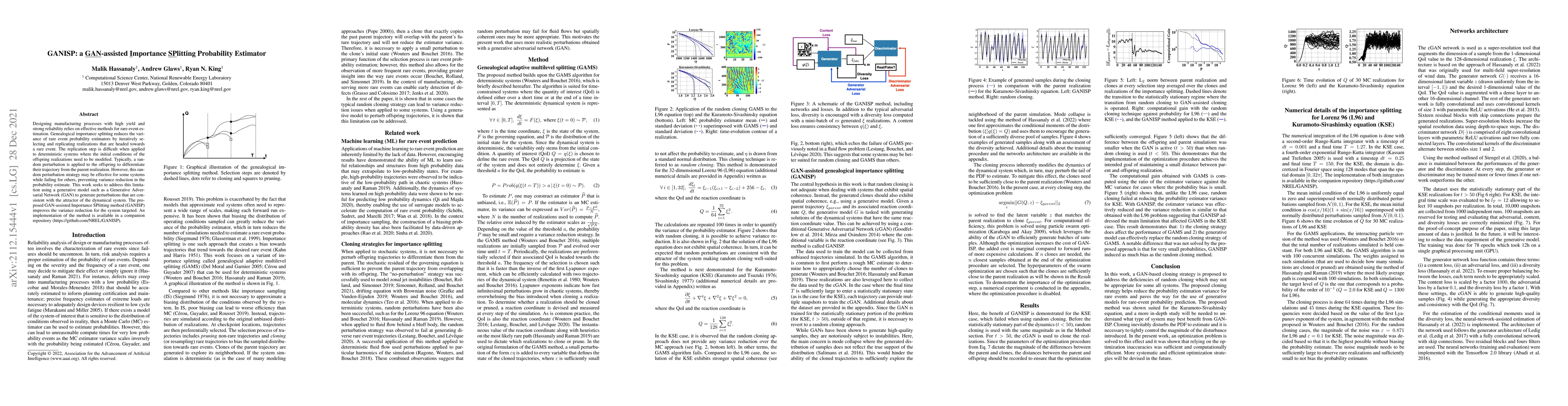 Designing manufacturing processes with high yield and strong reliability relies on effective methods for rare event estimation. Genealogical importance splitting reduces the variance of rare event probability estimators by iteratively selecting and replicating realizations that are headed towards a rare event. The replication step is difficult when applied to deterministic systems where the initial conditions of the offspring realizations need to be modified. Typically, a random perturbation is applied to the offspring to differentiate their trajectory from the parent realization. However, this random perturbation strategy may be effective for some systems while failing for others, preventing variance reduction in the probability estimate. This work seeks to address this limitation using a generative model such as a Generative Adversarial Network (GAN) to generate perturbations that are consistent with the attractor of the dynamical system. The proposed GAN-assisted Importance SPlitting method (GANISP) improves the variance reduction for the system targeted. An implementation of the method is available in a companion repository (https://github.com/NREL/GANISP).