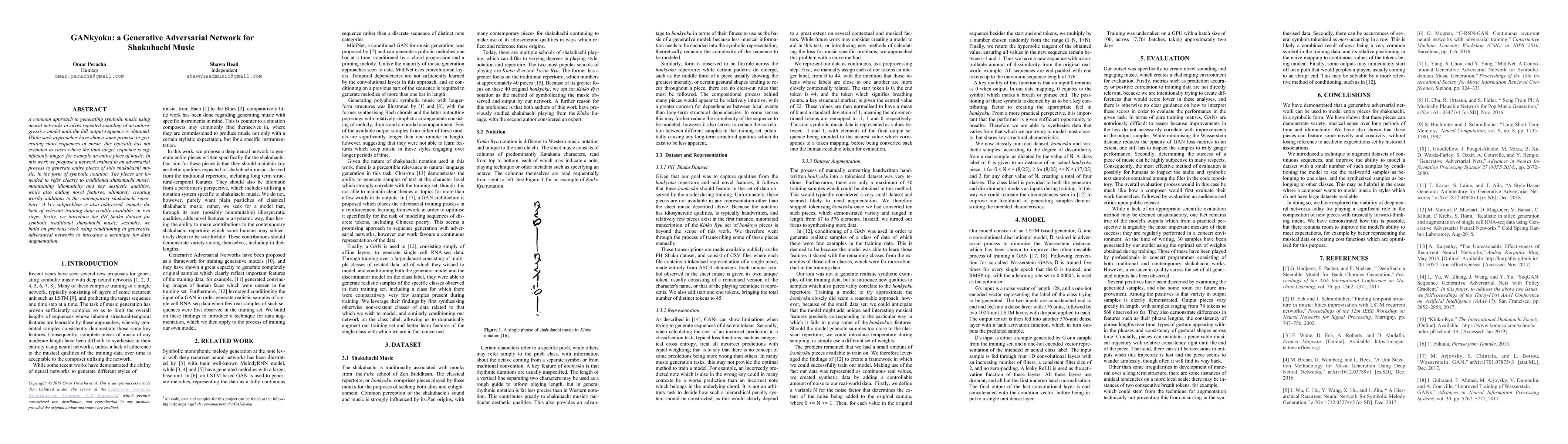 The paper proposes a Generative Adversarial Network (GAN) for generating entire pieces of solo shakuhachi music in the form of symbolic notation. It addresses the issue of lack of training data by introducing the PH_Shaku dataset and using data augmentation techniques.