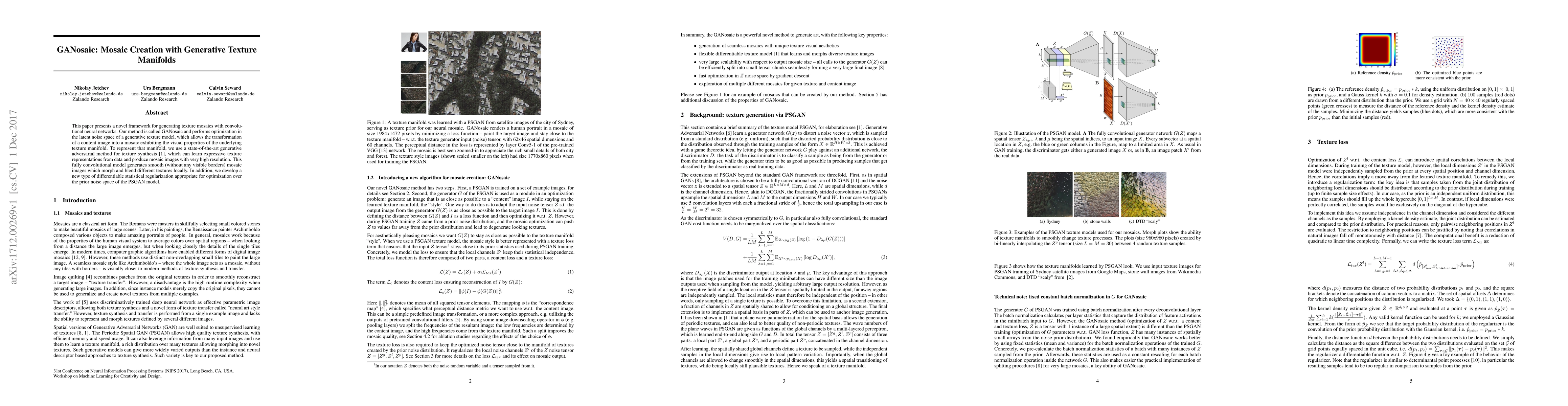 This paper presents a novel framework for generating texture mosaics with convolutional neural networks. Our method is called GANosaic and performs optimization in the latent noise space of a generative texture model, which allows the transformation of a content image into a mosaic exhibiting the visual properties of the underlying texture manifold. To represent that manifold, we use a state-of-the-art generative adversarial method for texture synthesis, which can learn expressive texture representations from data and produce mosaic images with very high resolution. This fully convolutional model generates smooth (without any visible borders) mosaic images which morph and blend different textures locally. In addition, we develop a new type of differentiable statistical regularization appropriate for optimization over the prior noise space of the PSGAN model.