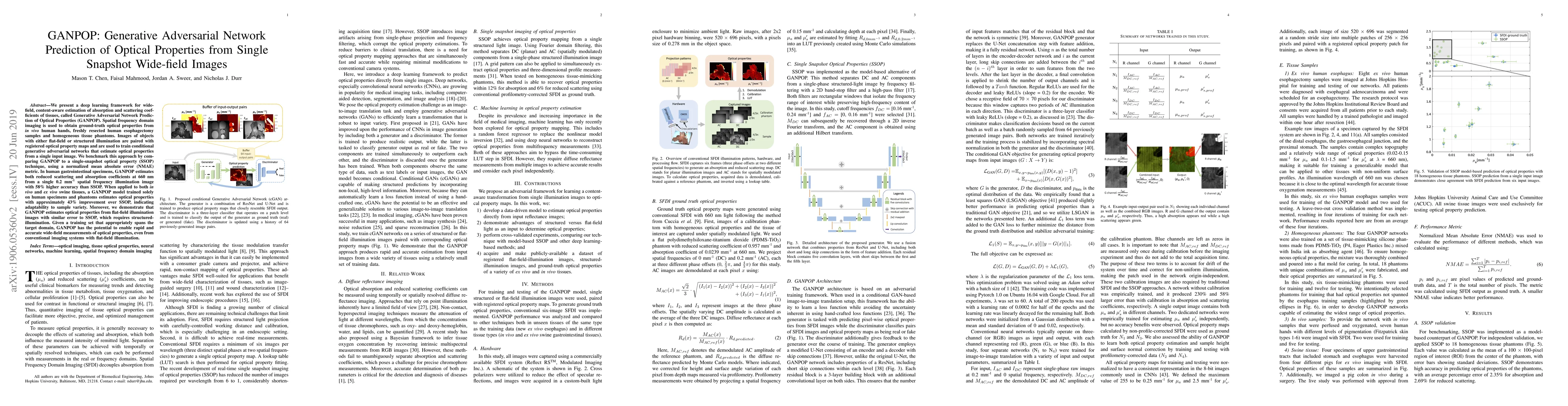 GANPOP is a deep learning framework using conditional generative adversarial networks to estimate tissue optical properties from single wide-field images, achieving higher accuracy than traditional SSOP techniques, especially in diverse tissue samples. It demonstrates adaptability and potential for rapid, accurate optical property measurements across various imaging systems.