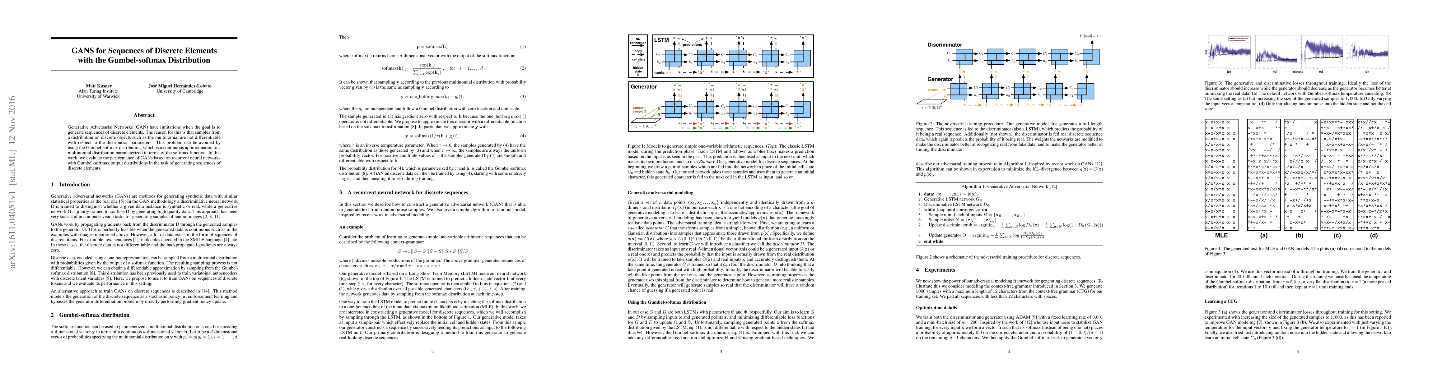 Generative Adversarial Networks (GAN) have limitations when the goal is to generate sequences of discrete elements. The reason for this is that samples from a distribution on discrete objects such as the multinomial are not differentiable with respect to the distribution parameters. This problem can be avoided by using the Gumbel-softmax distribution, which is a continuous approximation to a multinomial distribution parameterized in terms of the softmax function. In this work, we evaluate the performance of GANs based on recurrent neural networks with Gumbel-softmax output distributions in the task of generating sequences of discrete elements.