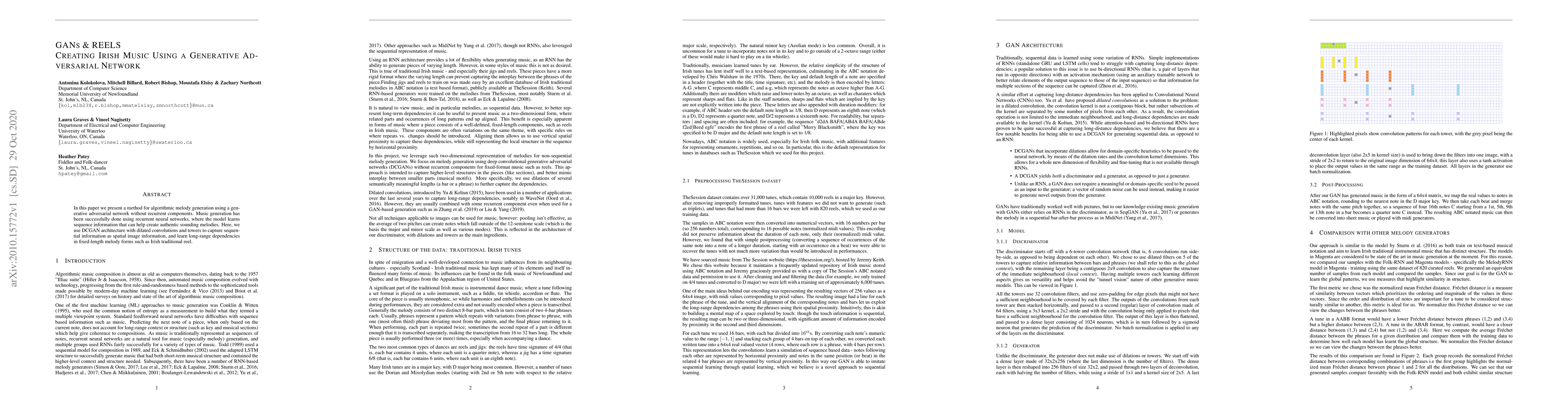 This paper introduces a DC-GAN architecture with dilated convolutions for generating authentic Irish traditional reel melodies without recurrent components, capturing sequential information through spatial image representation. The method aims to create long-range dependencies in fixed-length melody forms.