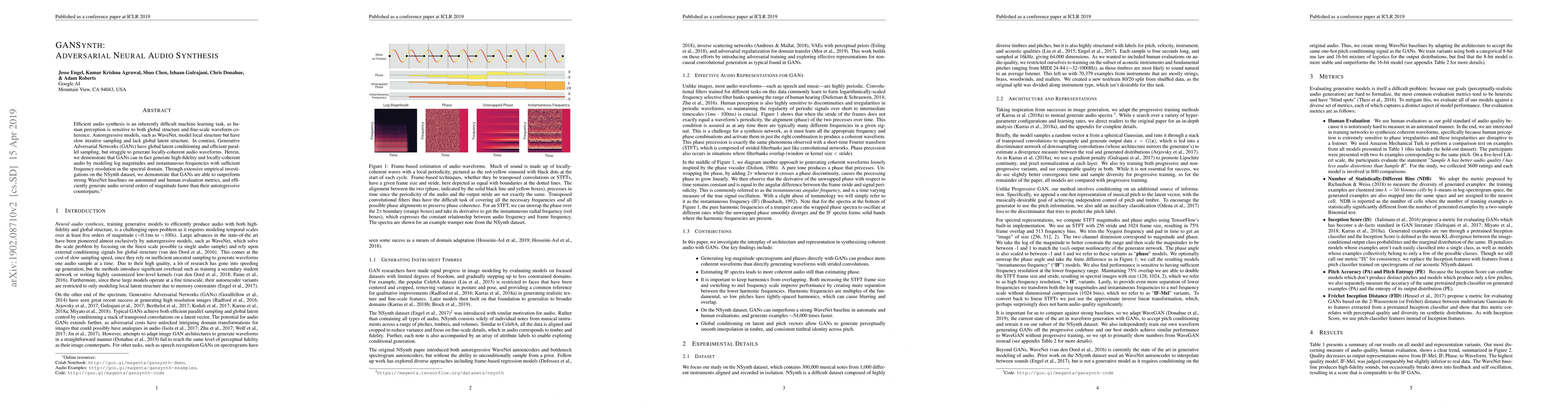 GANSynth leverages Generative Adversarial Networks for efficient audio synthesis, achieving high-fidelity and locally-coherent waveforms by modeling spectral domain features. It outperforms autoregressive models like WaveNet in both automated and human evaluations, while generating audio much faster.