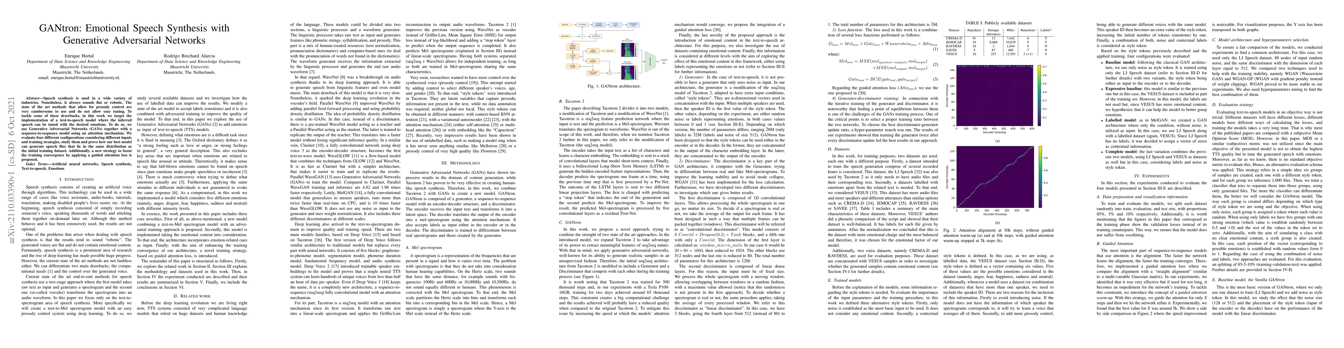 This paper presents GANtron, a text-to-speech model using Generative Adversarial Networks (GANs) and a sequence-to-sequence model with attention to synthesize emotional speech. The authors evaluate various configurations and propose a guided attention loss to improve training convergence, demonstrating that the best model can generate emotionally expressive speech.