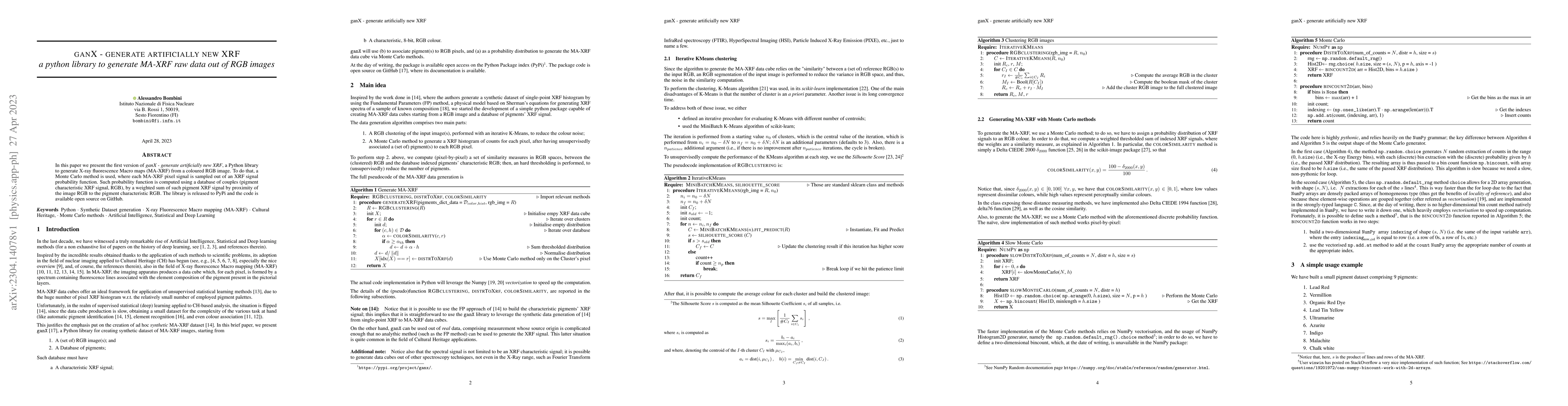 In this paper we present the first version of ganX -- generate artificially new XRF, a Python library to generate X-ray fluorescence Macro maps (MA-XRF) from a coloured RGB image. To do that, a Monte Carlo method is used, where each MA-XRF pixel signal is sampled out of an XRF signal probability function. Such probability function is computed using a database of couples (pigment characteristic XRF signal, RGB), by a weighted sum of such pigment XRF signal by proximity of the image RGB to the pigment characteristic RGB. The library is released to PyPi and the code is available open source on GitHub.