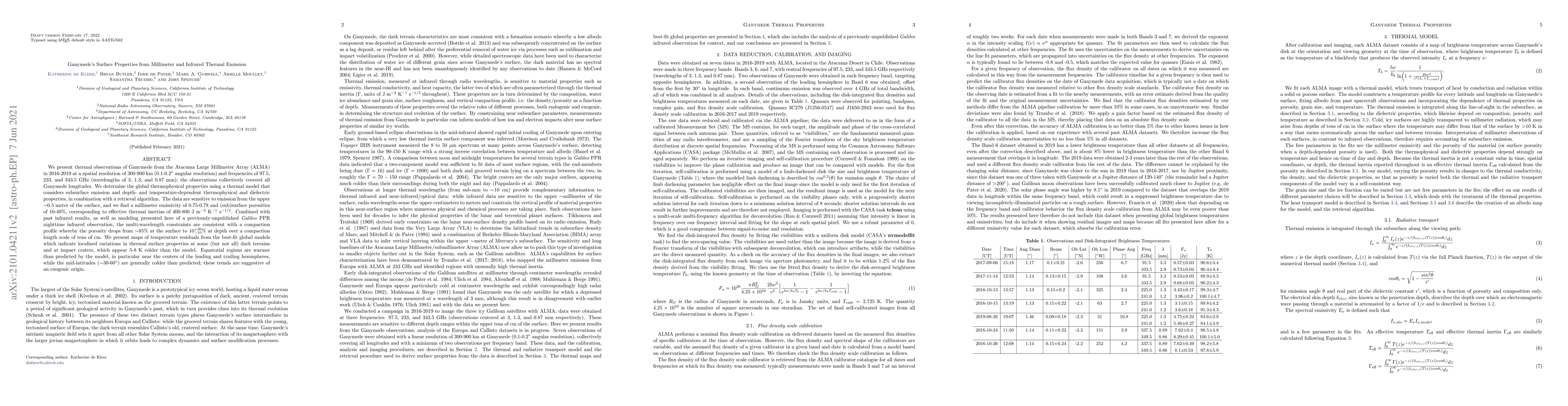 This study uses ALMA observations to determine Ganymede's surface thermophysical properties, finding a millimeter emissivity of 0.75-0.78 and subsurface porosities of 10-40%. The results suggest a compaction profile reducing surface porosity to 10% at depth.