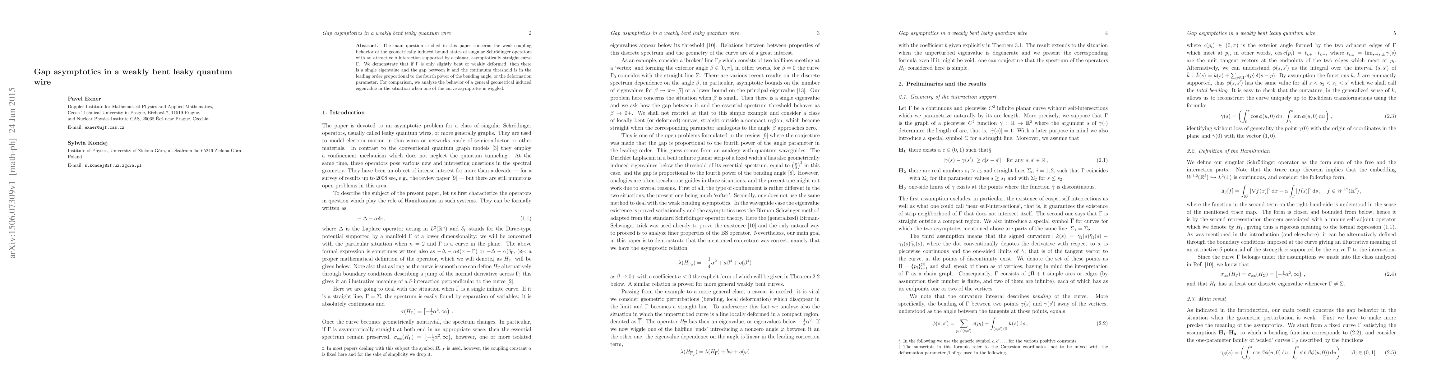 The main question studied in this paper concerns the weak-coupling behavior of the geometrically induced bound states of singular Schr\"odinger operators with an attractive $\delta$ interaction supported by a planar, asymptotically straight curve $\Gamma$. We demonstrate that if $\Gamma$ is only slightly bent or weakly deformed, then there is a single eigenvalue and the gap between it and the continuum threshold is in the leading order proportional to the fourth power of the bending angle, or the deformation parameter. For comparison, we analyze the behavior of a general geometrical induced eigenvalue in the situation when one of the curve asymptotes is wiggled.