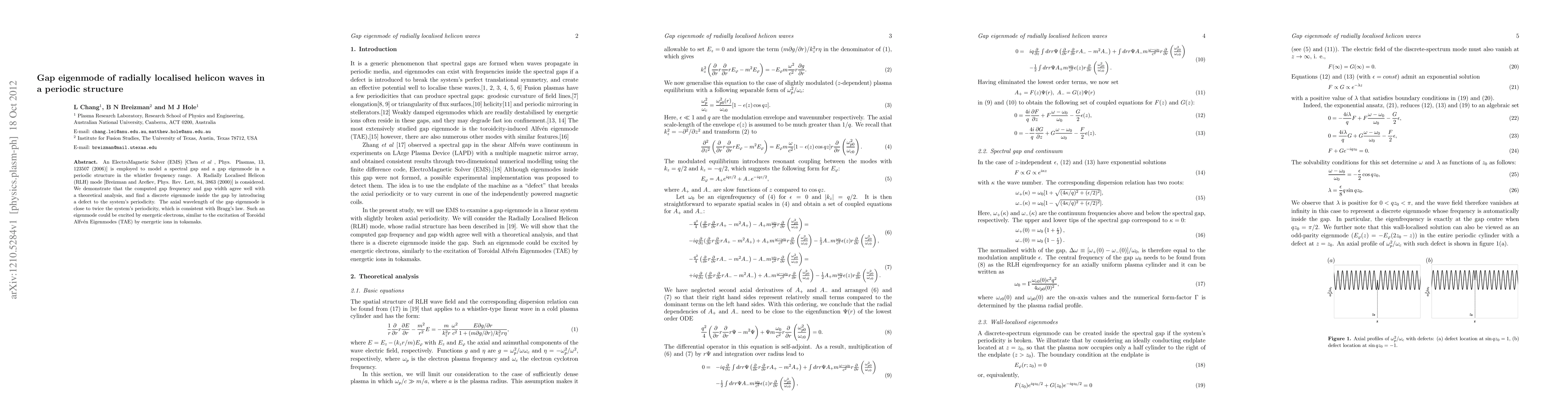 An ElectroMagnetic Solver (EMS) [Chen et al., Phys. Plasmas, 13, 123507 (2006)] is employed to model a spectral gap and a gap eigenmode in a periodic structure in the whistler frequency range. A Radially Localised Helicon (RLH) mode [Breizman and Arefiev, Phys. Rev. Lett, 84, 3863 (2000)] is considered. We demonstrate that the computed gap frequency and gap width agree well with a theoretical analysis, and find a discrete eigenmode inside the gap by introducing a defect to the system's periodicity. The axial wavelength of the gap eigenmode is close to twice the system's periodicity, which is consistent with Bragg's law. Such an eigenmode could be excited by energetic electrons, similar to the excitation of Toroidal Alfv\'{e}n Eigenmodes (TAE) by energetic ions in tokamaks.