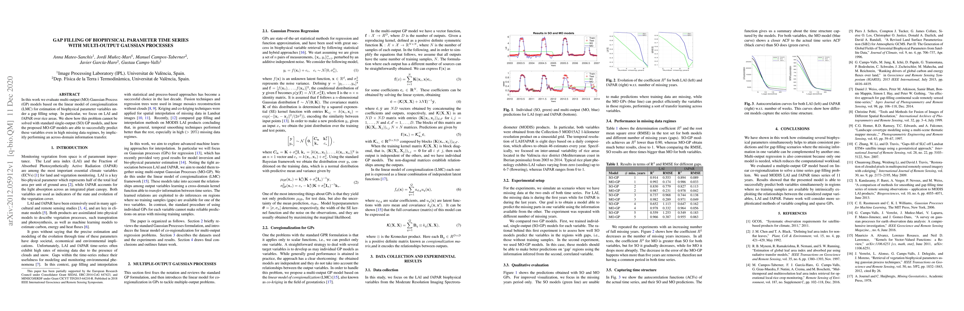 This paper evaluates multi-output Gaussian Process models for estimating biophysical parameters like LAI and fAPAR in rice areas under high missing data conditions. The study demonstrates that these models outperform single-output GPs by effectively transferring information across domains.