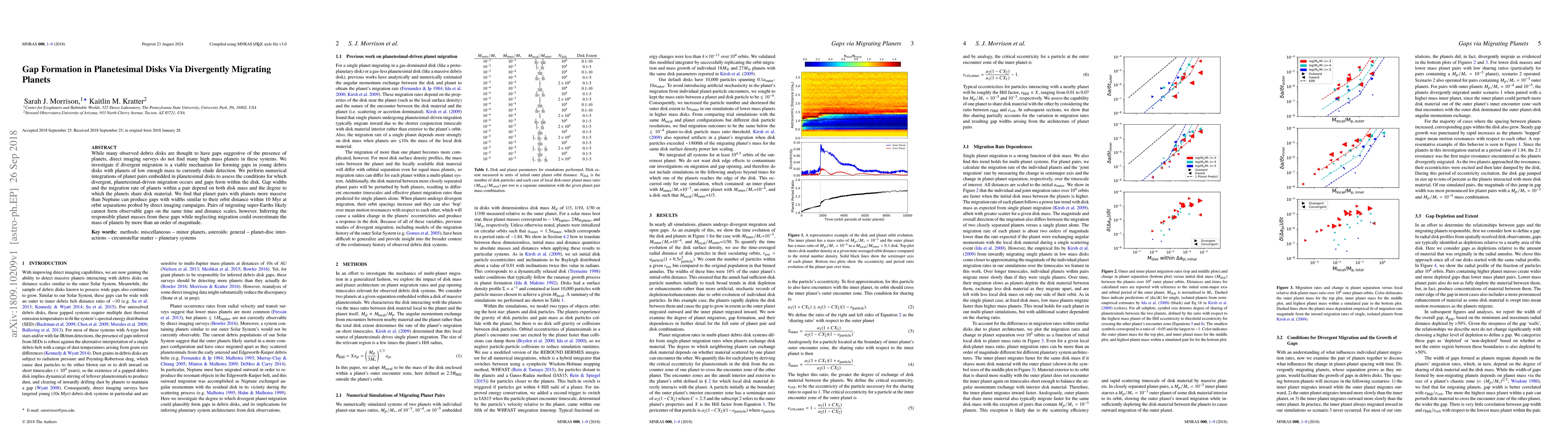 This paper explores the formation of gaps in planetesimal disks via divergent migration of planets, finding that Neptune-mass planets can create observable gaps within 10 Myr, while super-Earths are unlikely to do so. Ignoring migration effects could significantly overestimate planet masses inferred from these gaps.