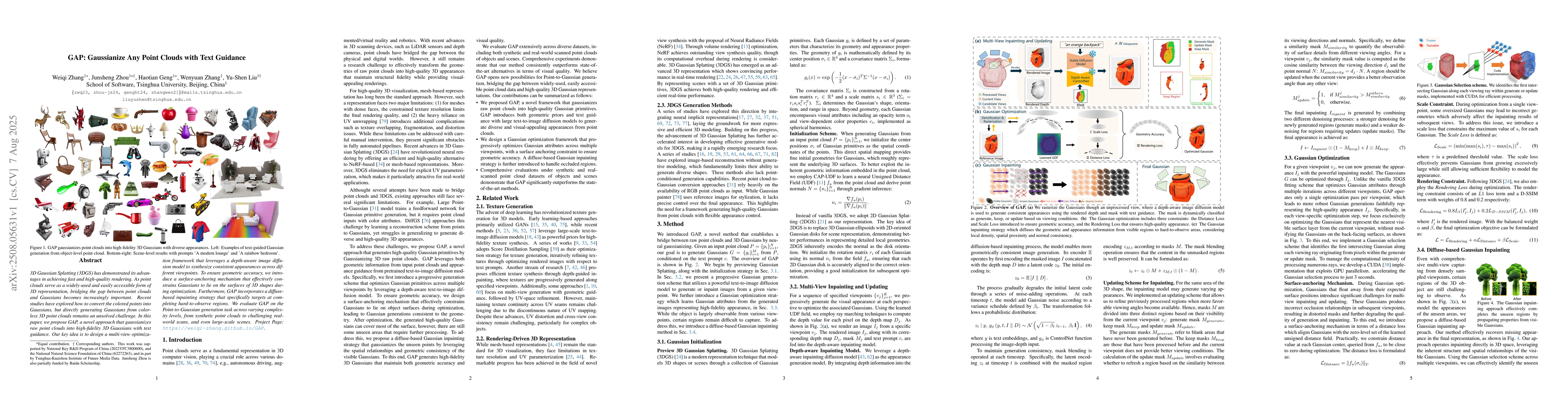 3D Gaussian Splatting (3DGS) has demonstrated its advantages in achieving fast and high-quality rendering. As point clouds serve as a widely-used and easily accessible form of 3D representation, bridging the gap between point clouds and Gaussians becomes increasingly important. Recent studies have explored how to convert the colored points into Gaussians, but directly generating Gaussians from colorless 3D point clouds remains an unsolved challenge. In this paper, we propose GAP, a novel approach that gaussianizes raw point clouds into high-fidelity 3D Gaussians with text guidance. Our key idea is to design a multi-view optimization framework that leverages a depth-aware image diffusion model to synthesize consistent appearances across different viewpoints. To ensure geometric accuracy, we introduce a surface-anchoring mechanism that effectively constrains Gaussians to lie on the surfaces of 3D shapes during optimization. Furthermore, GAP incorporates a diffuse-based inpainting strategy that specifically targets at completing hard-to-observe regions. We evaluate GAP on the Point-to-Gaussian generation task across varying complexity levels, from synthetic point clouds to challenging real-world scans, and even large-scale scenes. Project Page: https://weiqi-zhang.github.io/GAP.