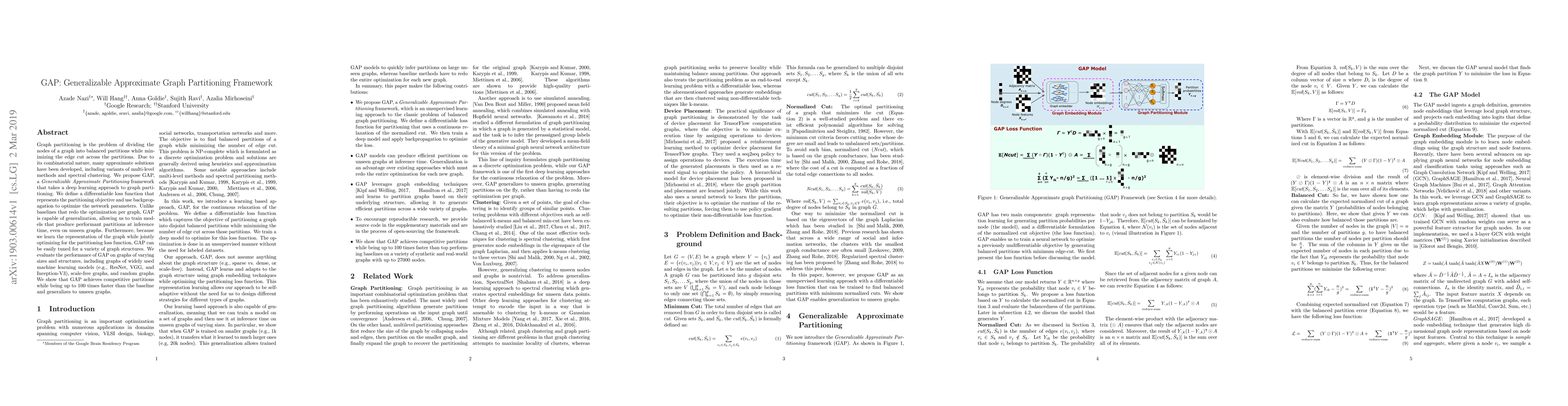 Graph partitioning is the problem of dividing the nodes of a graph into balanced partitions while minimizing the edge cut across the partitions. Due to its combinatorial nature, many approximate solutions have been developed, including variants of multi-level methods and spectral clustering. We propose GAP, a Generalizable Approximate Partitioning framework that takes a deep learning approach to graph partitioning. We define a differentiable loss function that represents the partitioning objective and use backpropagation to optimize the network parameters. Unlike baselines that redo the optimization per graph, GAP is capable of generalization, allowing us to train models that produce performant partitions at inference time, even on unseen graphs. Furthermore, because we learn the representation of the graph while jointly optimizing for the partitioning loss function, GAP can be easily tuned for a variety of graph structures. We evaluate the performance of GAP on graphs of varying sizes and structures, including graphs of widely used machine learning models (e.g., ResNet, VGG, and Inception-V3), scale-free graphs, and random graphs. We show that GAP achieves competitive partitions while being up to 100 times faster than the baseline and generalizes to unseen graphs.