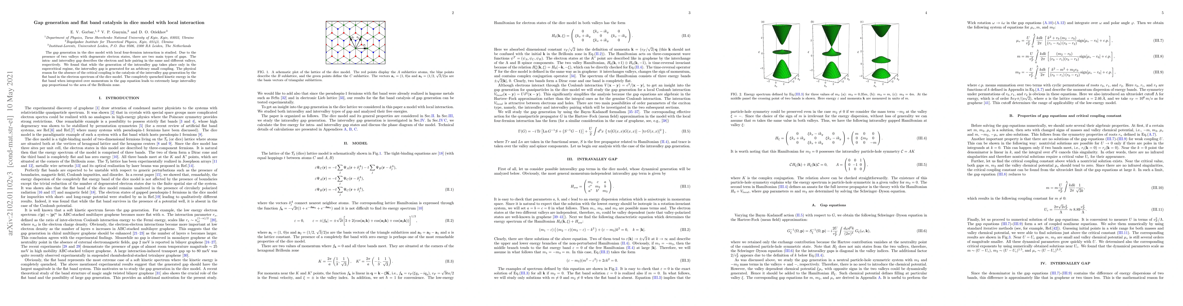 This paper investigates the gap generation in the dice model with local four-fermion interactions, revealing that the intervalley gap forms even with minimal coupling due to catalysis by the flat band, while the intravalley gap only forms in the supercritical regime. The flat band's quenched kinetic energy significantly enhances the intervalley gap size.