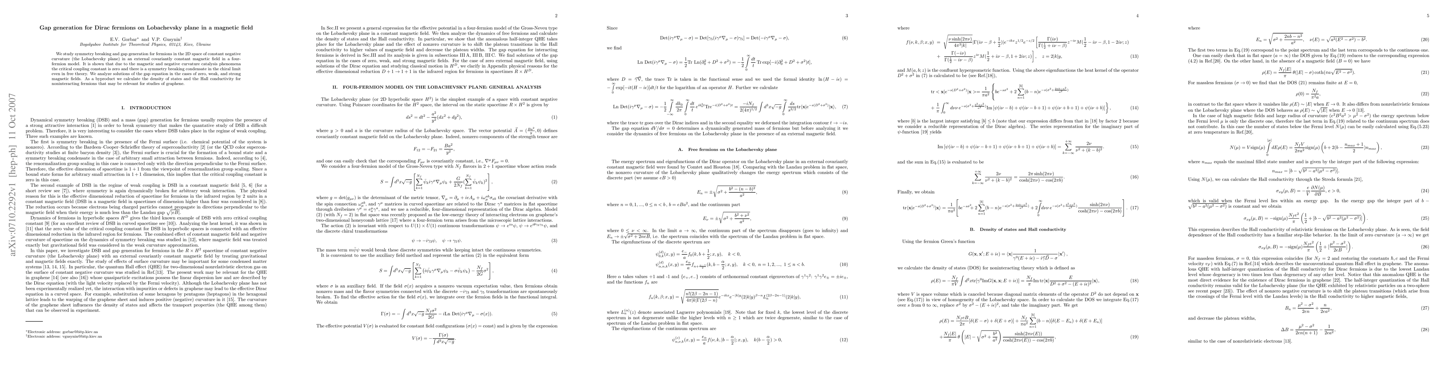 This paper investigates symmetry breaking and gap generation for Dirac fermions on a Lobachevsky plane under a magnetic field, revealing that zero critical coupling leads to a symmetry breaking condensate in the chiral limit. The study also calculates the density of states and Hall conductivity for noninteracting fermions, which could be relevant for graphene research.
