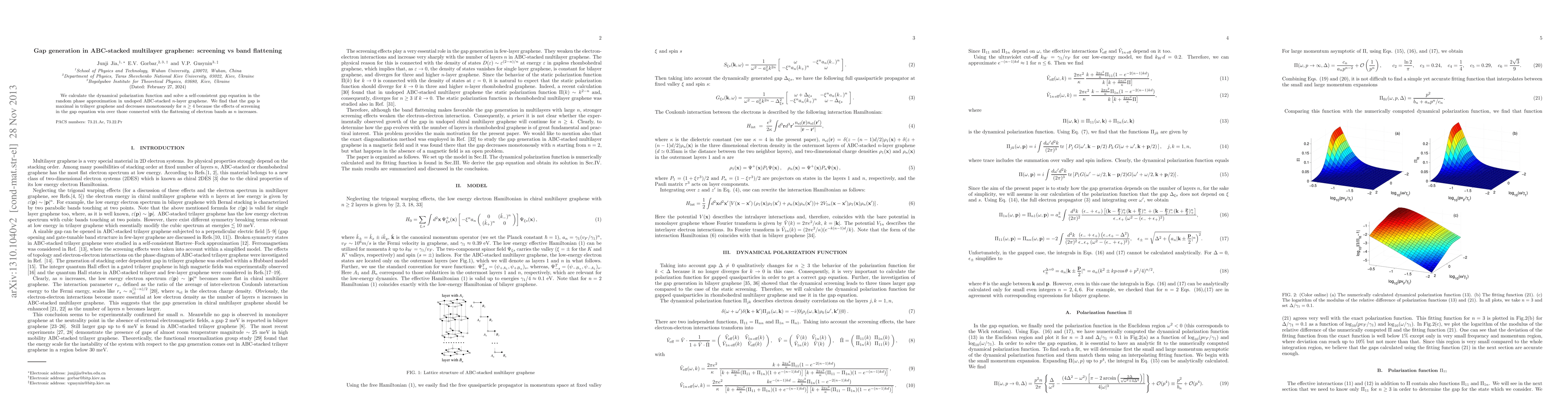 This study investigates the gap generation in undoped ABC-stacked multilayer graphene, revealing that the maximal gap occurs in trilayer graphene, while it decreases for $n \ge 4$ due to the dominance of screening effects over band flattening.