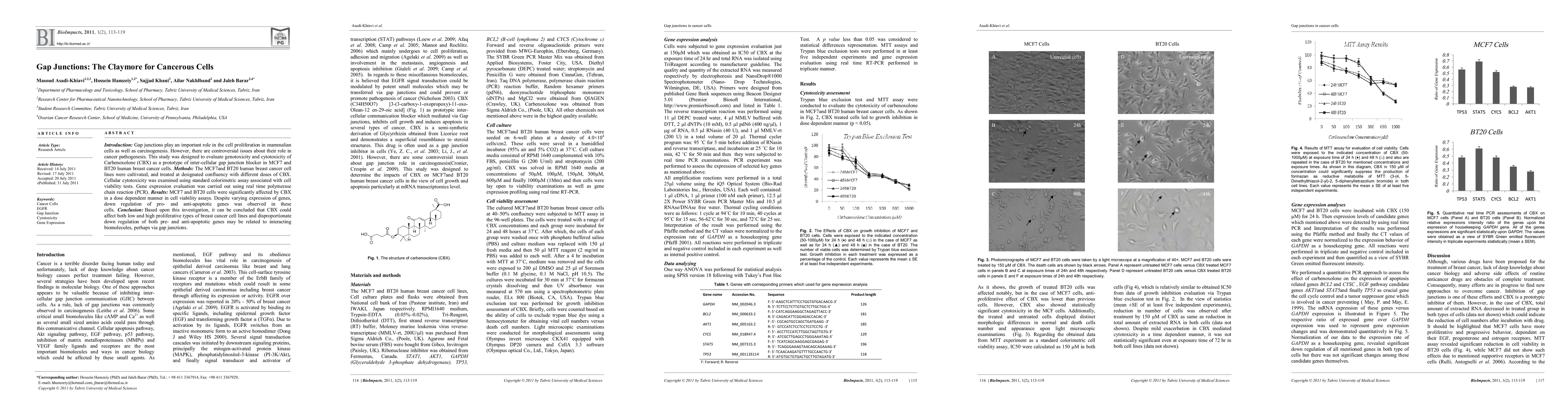 Introduction: Gap junctions play an important role in the cell proliferation in mammalian cells as well as carcinogenesis. However, there are controversial issues about their role in cancer pathogenesis. This study was designed to evaluate genotoxicity and cytotoxicity of Carbenoxolone (CBX) as a prototype of inter-cellular gap junction blocker in MCF7 and BT20 human breast cancer cells. Methods: The MCF7and BT20 human breast cancer cell lines were cultivated, and treated at designated confluency with different doses of CBX. Cellular cytotoxicity was examined using standard colorimetric assay associated with cell viability tests. Gene expression evaluation was carried out using real time polymerase chain reaction (PCR). Results: MCF7 and BT20 cells were significantly affected by CBX in a dose dependent manner in cell viability assays. Despite varying expression of genes, down regulation of pro- and anti-apoptotic genes was observed in these cells. Conclusion: Based upon this investigation, it can be concluded that CBX could affect both low and high proliferative types of breast cancer cell lines and disproportionate down regulation of both pre- and anti-apoptotic genes may be related to interacting biomolecules, perhaps via gap junctions.