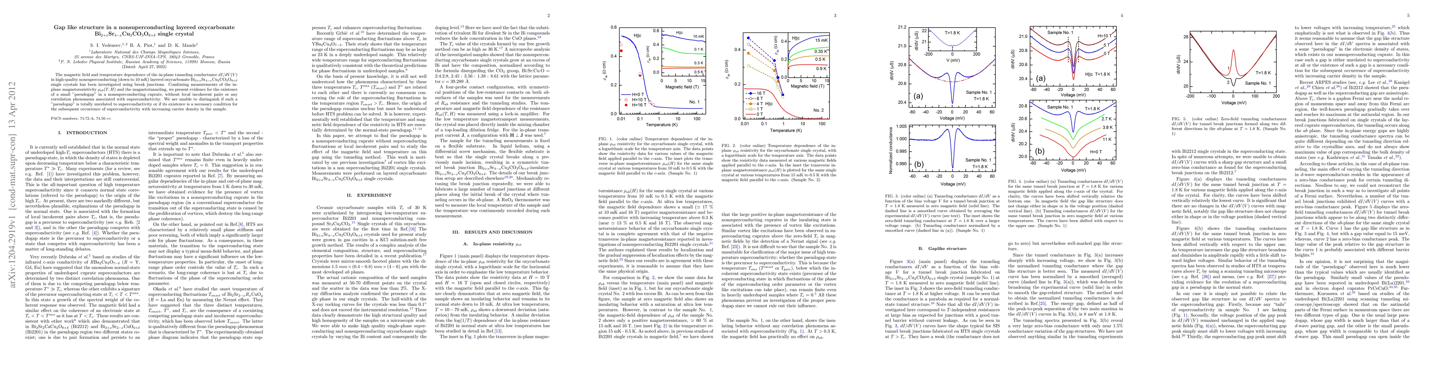 The magnetic field and temperature dependence of the in-plane tunneling conductance $dI/dV(V)$ in high-quality nonsuperconducting (down to 10 mK) layered oxycarbonate Bi$_{2+x}$Sr$_{4-x}$Cu$_2$CO$_3$O$_{8+\delta}$ single crystals has been investigated using break junctions. Combining measurements of the in-plane magnetoresistivity $\rho_{ab}(T,H)$ and the magnetotunneling, we present evidence for the existence of a small "pseudogap" in a nonsuperconducting cuprate, without local incoherent pairs or any correlation phenomena associated with superconductivity. We are unable to distinguish if such a "pseudogap" is totally unrelated to superconductivity or if its existence is a necessary condition for the subsequent occurrence of superconductivity with increasing carrier density in the sample.